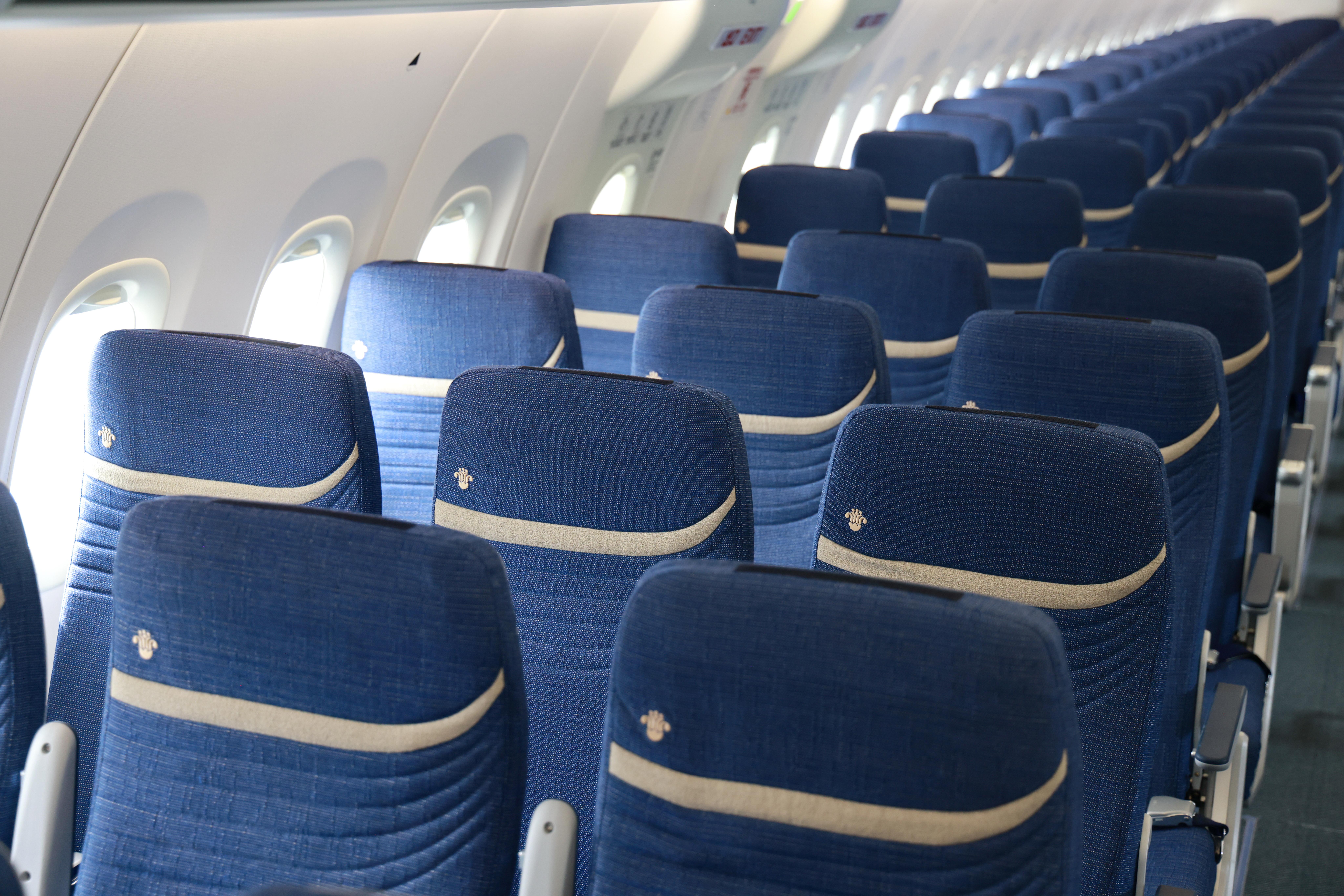 南航新一代客舱内饰以“国风清雅、沐光而行”为设计主题,通过明快柔和的色调搭配与新型环保工艺,将中式审美元素与现代简约风格相融合,展现东方之美与当代质感。公务舱座椅采用浅灰色真皮头枕与棕灰色真皮主体,辅以精致的缝线与柔和的皮质光感。明珠经济舱座椅选用了米灰色羊毛织物作为主材质,搭配真皮条纹装饰,既有柔软亲肤的触感,又保持了简约大气的视觉效果。经济舱座椅采用天空蓝羊毛织物与浅米色侧边装饰,整体色调清新明快,营造轻盈、放松的乘坐氛围,缓解长途飞行的视觉疲劳,也传递出南航“让更多人乐享美好飞行”的真诚关怀。未来,南航新一代客舱内饰将遵循“统一升级、精准适配”的原则,分阶段推进实施。
