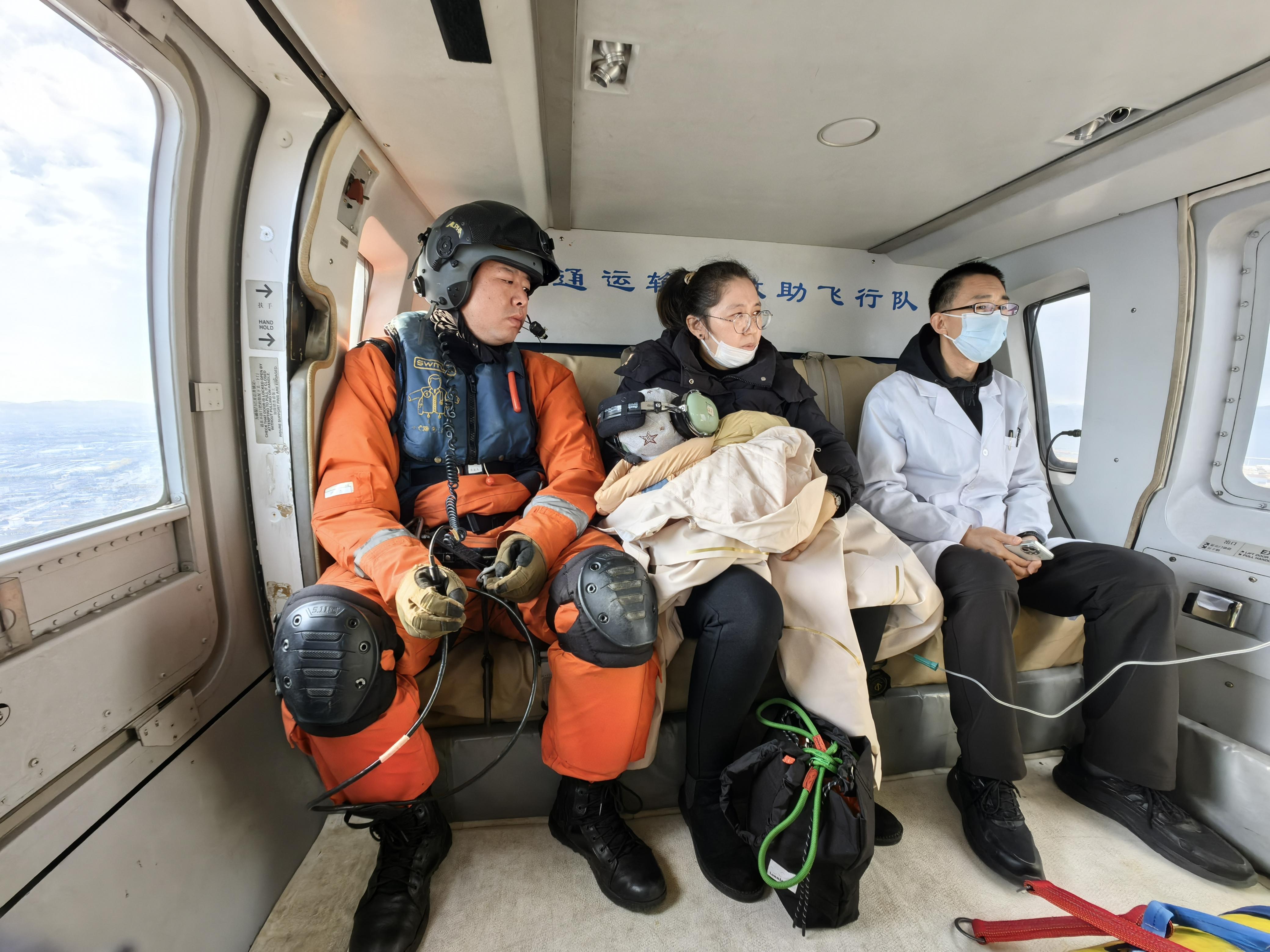 起飞5分钟后,救助直升机降落南长山岛起降点,在现场等待6分钟,患儿和家属抵达起降点后,机组立即将其接至救助直升机。飞行途中,考虑患儿月龄小、病情危重,任何颠簸或延误都可能危及生命。救助直升机机组凭借精湛的飞行技术与丰富的救助经验,在确保安全的前提下全力提速,与病魔争夺分秒。