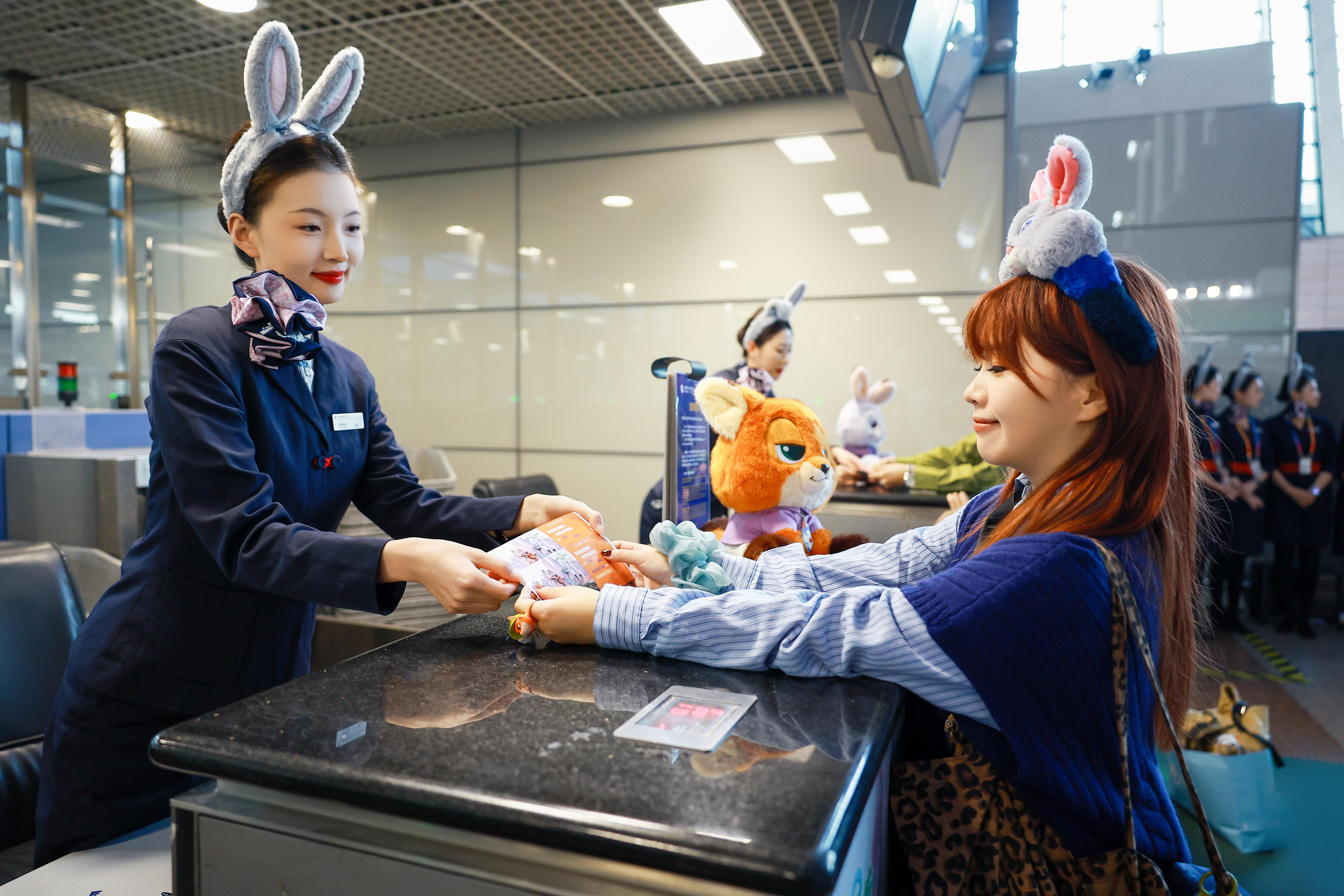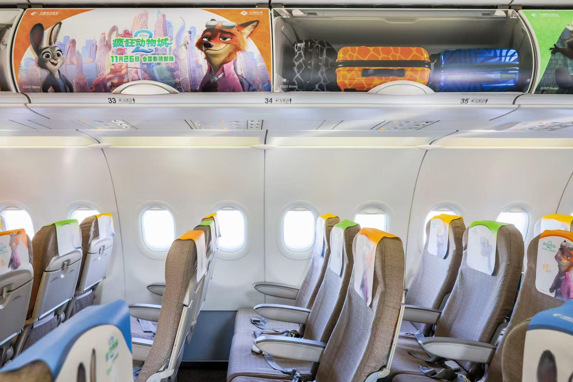 此次主题航班以迪士尼现象级IP“疯狂动物城”为核心载体,构建了“航站楼—客舱—空中旅途”的全流程沉浸式体验。在浦东机场T1航站楼,东航B岛值机柜台与自助设备、爱心服务区、休息座椅、客梯、登机口等处均以“疯狂动物城”元素装点,主题布置场景成为旅客争相打卡的地标。此外,东航与上海迪士尼度假区于2024年5月合作推出的“迪士尼•疯狂动物城号”主题彩绘机也完成了客舱内饰的焕新升级——新电影中动物城的街景以及朱迪、尼克等经典角色跃出银幕,出现在行李架、小桌板与头枕巾等客舱细节中,生动呈现全球唯一“疯狂动物城”的故事与新体验。在航班飞行途中,机上乘务员还佩戴“疯狂动物城”主题饰品,在互动环节为旅客送上多种周边礼品。