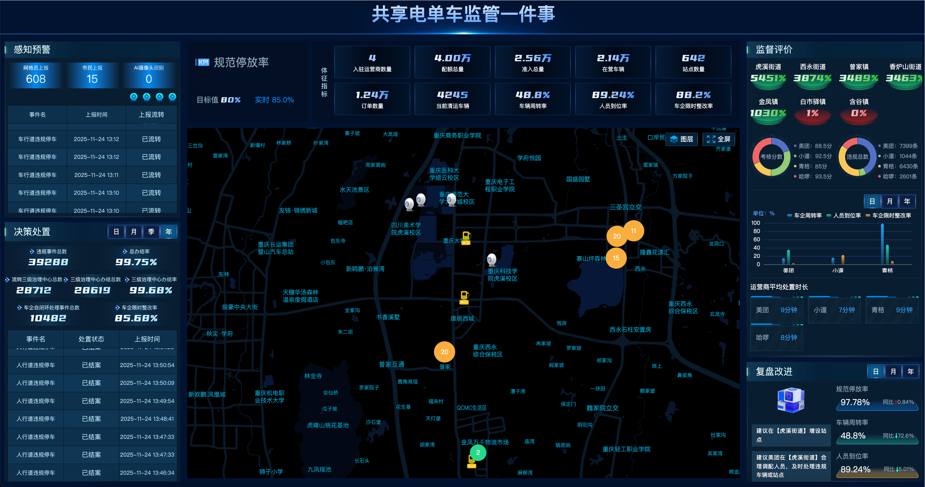 “以前管理共享电动车,全靠人工巡查,不仅耗时耗力,还容易出现监管盲区。现在有了数字化治理平台,违规问题能实时发现、快速处置,管理效率大幅提升。”重庆高新区城市建设事务中心工作人员介绍,该区自主研发的共享电单车监管“一件事”应用平台(简称“一件事”平台),实现了共享出行管理从“线下分散”到“线上集约”的跨越式转变。