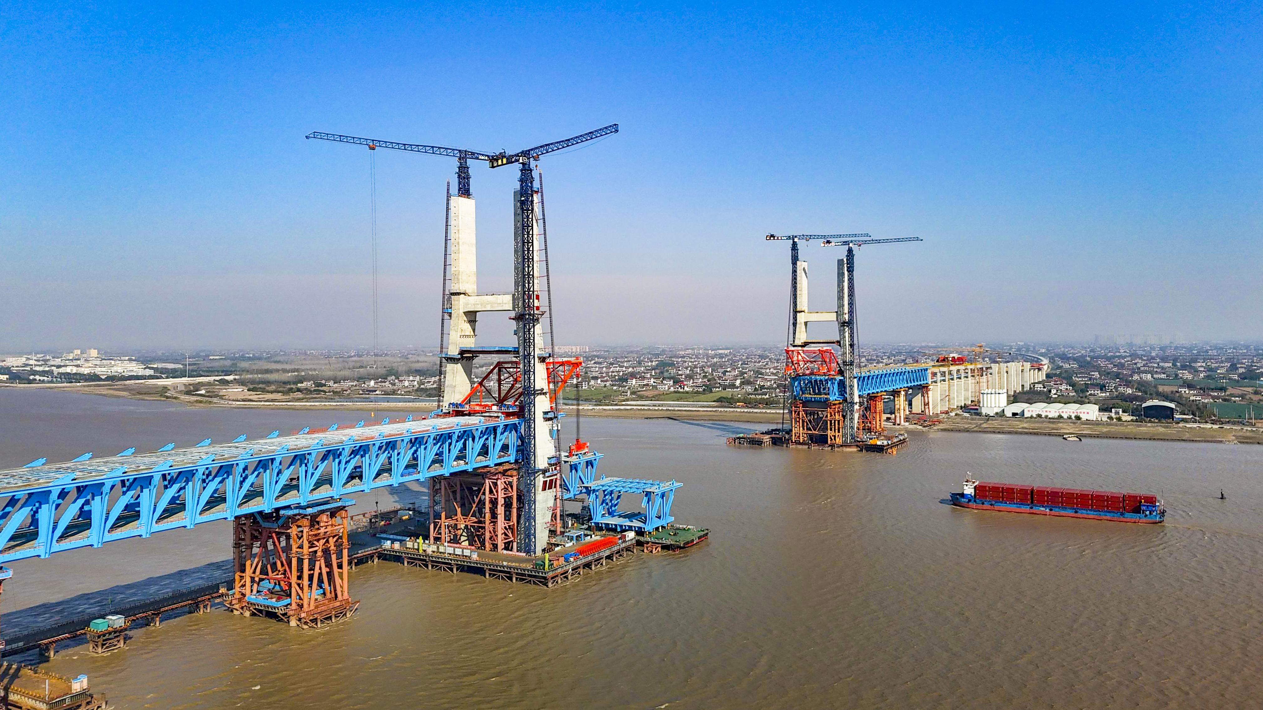11月20日,随着大桥北岸(启东侧)最后一段边跨钢梁精准落位,历时158天、吊装跨度达1205.4米的崇启跨江公铁大桥非通航孔水上吊装作业圆满完成,项目整体施工进度达80%,这标志着国家“八纵八横”高速铁路网沿江高铁通道的控制性工程离正式建成又向前迈出一大步。