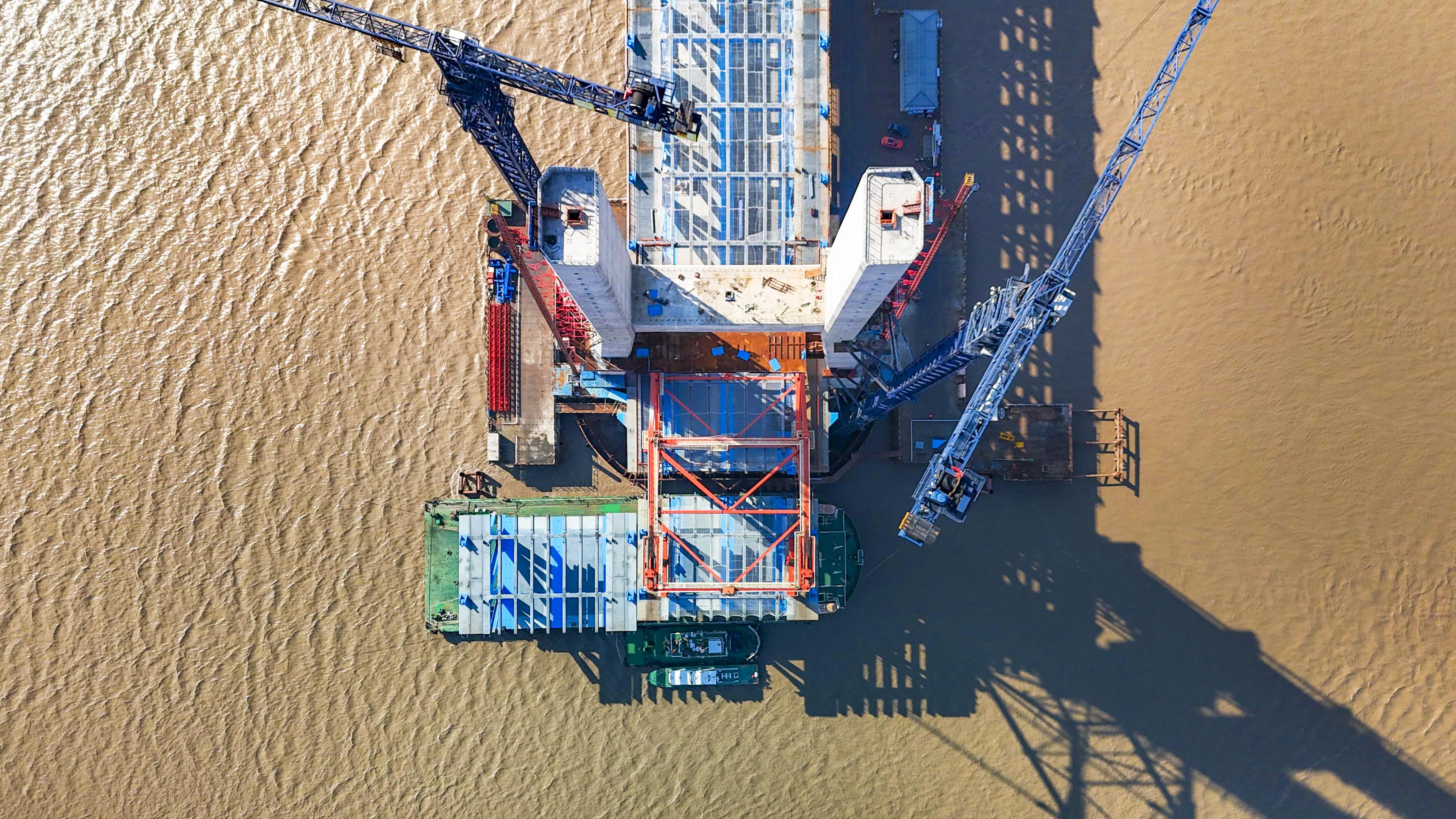 据悉,崇启公铁长江大桥非通航孔共有11个桥墩,顶推长度为1205.4米。钢梁在工厂完工后通过水上运输船运到大桥南岸预拼场进行吊装组拼,再分13个轮次(其中9个轮次为112米)向主通航孔方向顶推。此次是最后一轮的吊装顶推作业,因进入寒潮大风天,加上施工时间长,精准要求度高,叠加潮汐落差大、瞬时风力强等复杂水文气象条件,安全风险高。