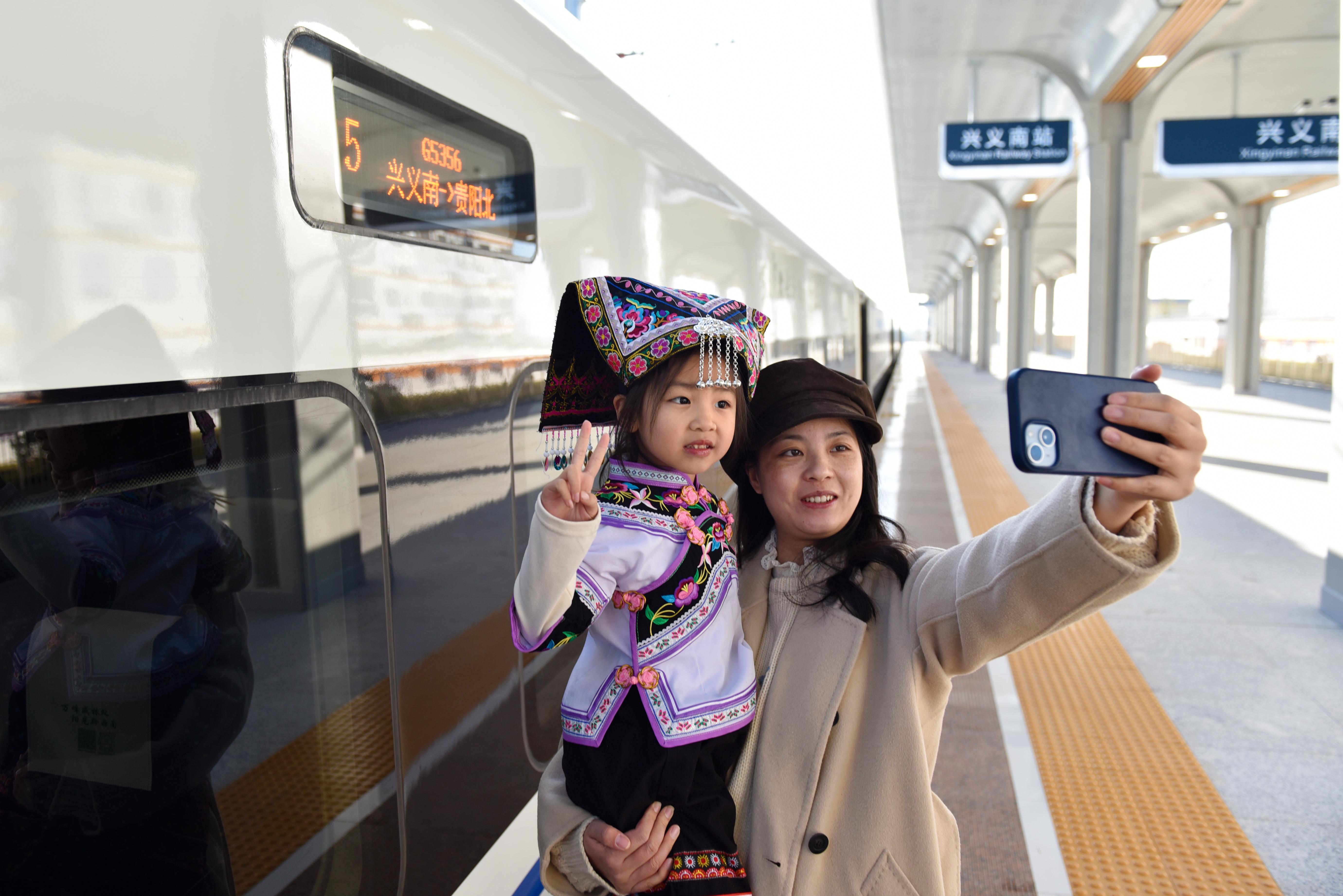 站台上,人头攒动,热闹非凡。由布依族青年组成的“民族班组”手持欢迎牌在站台列队,成为旅客争相合影的“移动风景”。虽已过小雪时节,但黔西南的暖阳与人们的热情相互映衬,暖意融融。