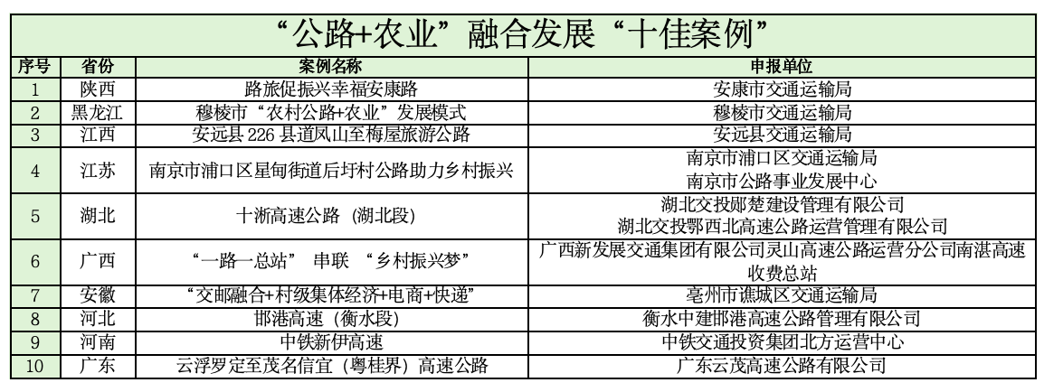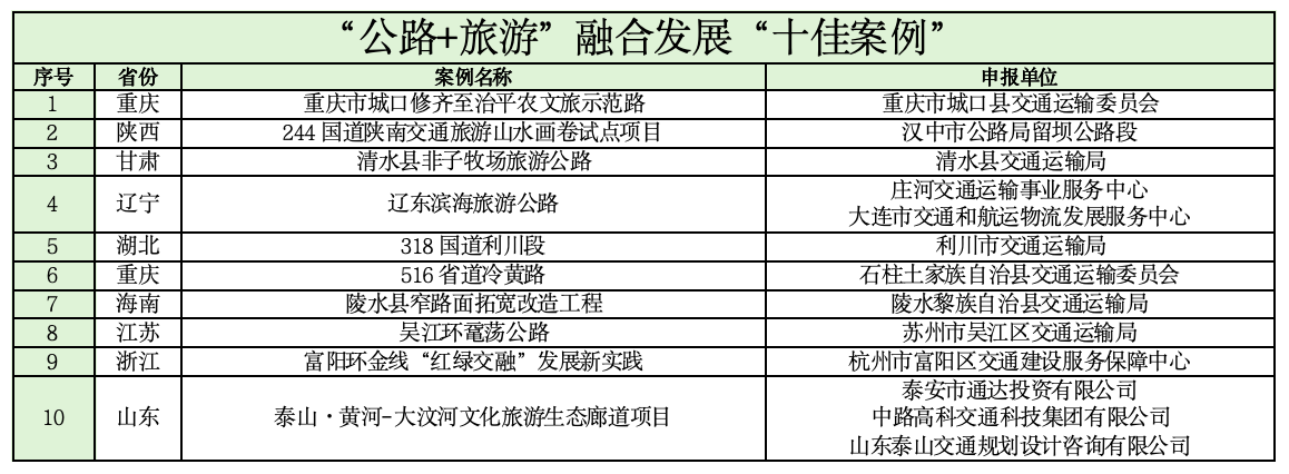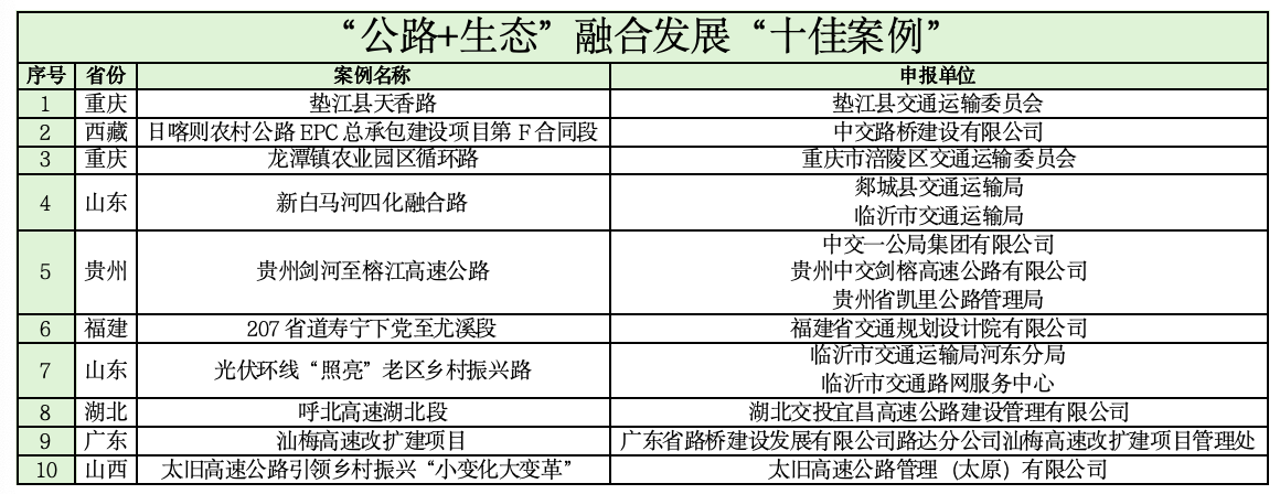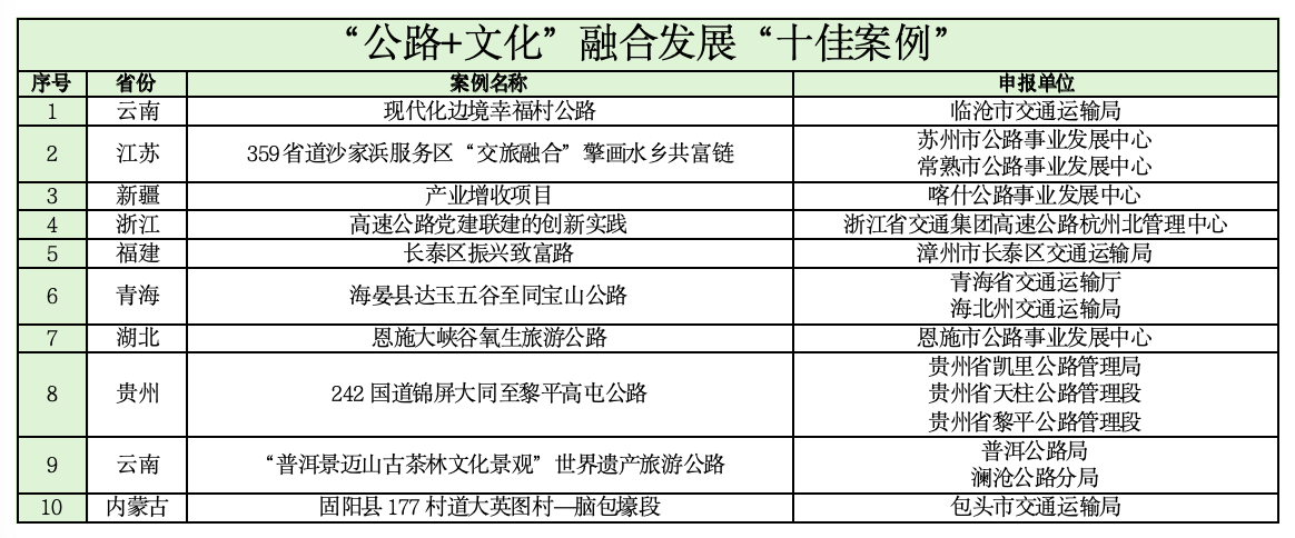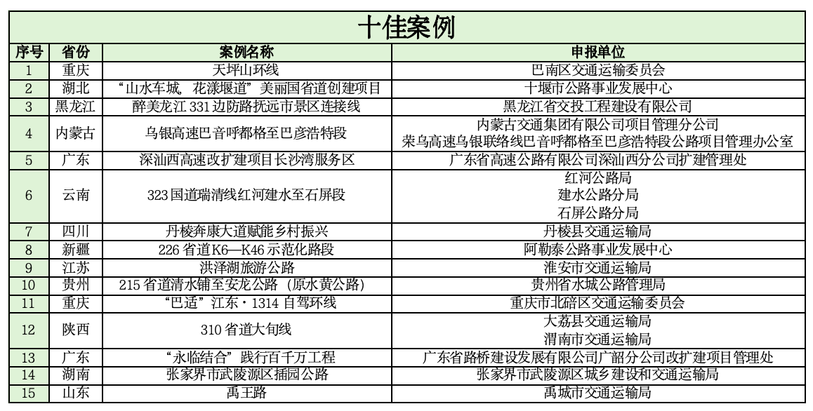 活动自2025年5月启动以来,在行业内受到广泛关注,活动组委会办公室共收到250余个申报案例。经过项目征集、专家审核、案例展示等程序,通过综合考量组织领导、理念创新、实效凸显、生态环保、智慧赋能、文化传承、治理效能、宣传成果、区域联动、示范推广等10项指标,“天坪山环线”等15个案例入选2025年“公路助力乡村振兴”创新实践“十佳案例”,“重庆市城口修齐至治平农文旅示范路”“路旅促振兴幸福安康路”“359省道沙家浜服务区‘交旅融合’擎画水乡共富链”“垫江县天香路”等40个案例分别入选2025年“公路助力乡村振兴”创新实践“公路+旅游”融合发展“十佳案例”、“公路+农业”融合发展“十佳案例”、“公路+文化”融合发展“十佳案例”、“公路+生态”融合发展“十佳案例”。