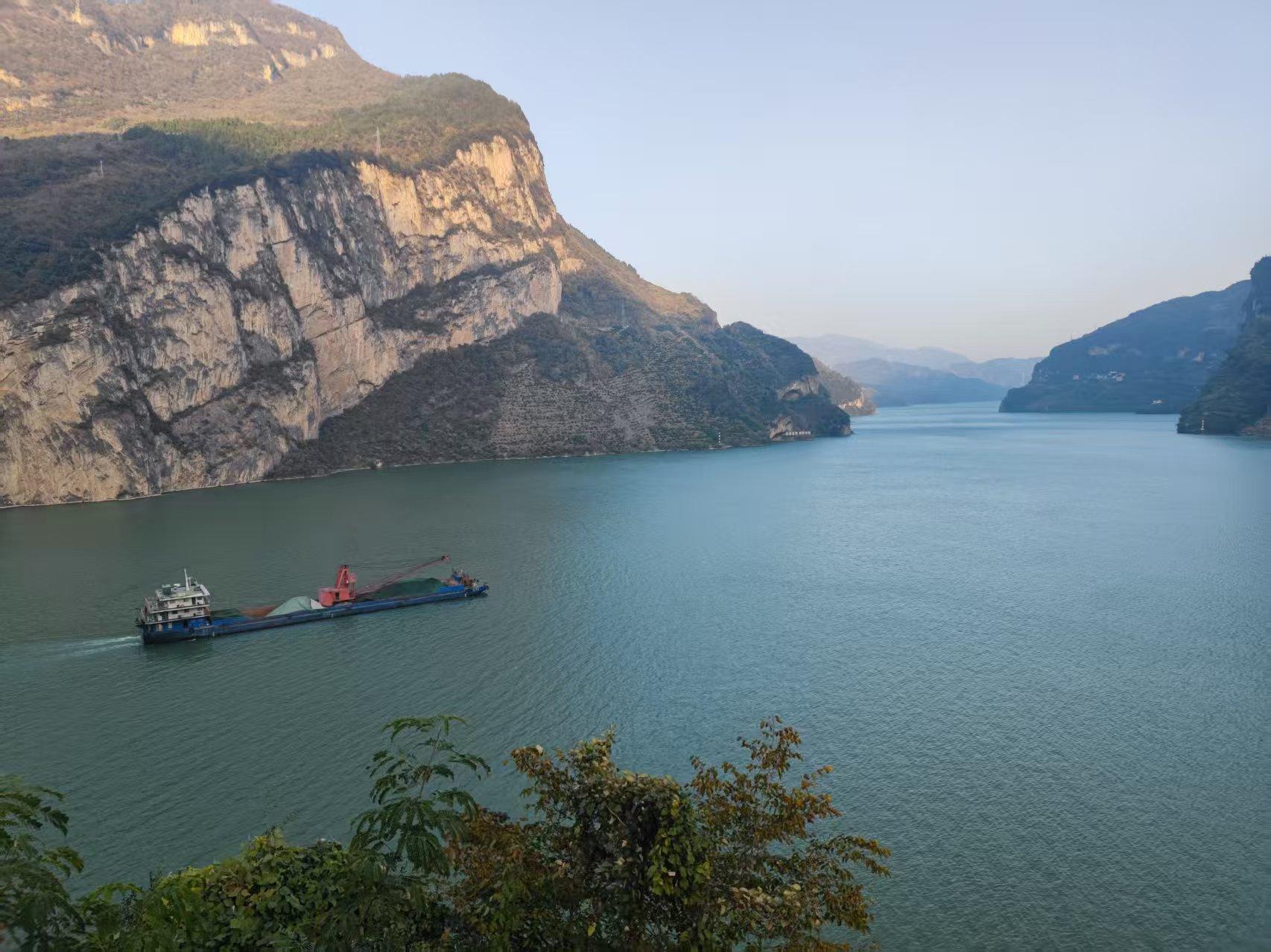 12月9日,暖阳下的宜昌秭归西陵峡畔,山青水碧,满载的货轮激荡着一江秋水,唤醒了远处静卧的小狗山。