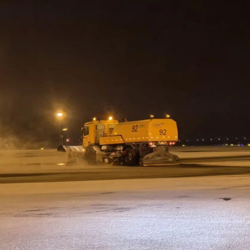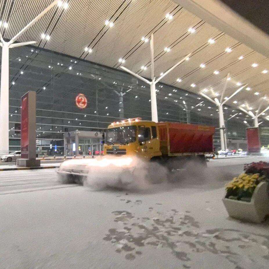 为确保进出机场道路畅通,天津滨海机场对公共区域进行除雪作业。截至凌晨2时,共出动装载机1部,多功能除雪车2 部,洒水车1部,出动人工68人,使用融雪剂10 吨,融雪盐1吨,机场大道、高架桥等道路均畅通无积雪。