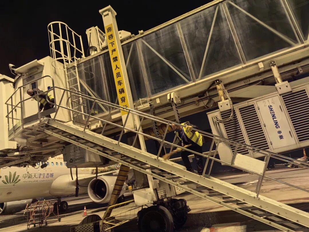 服务方面,天津滨海机场在航站楼出发门斗处铺设地毯,出发层高架桥上安排人员随时进行积雪清扫,人工清除廊桥挂梯、高架桥平台的积雪,并对手推车进行雪水的擦拭保障旅客安全出行。天津滨海机场在登机口安排人员进行航班动态通报,同时重点做好远机位登机口及机下旅客安全提示。