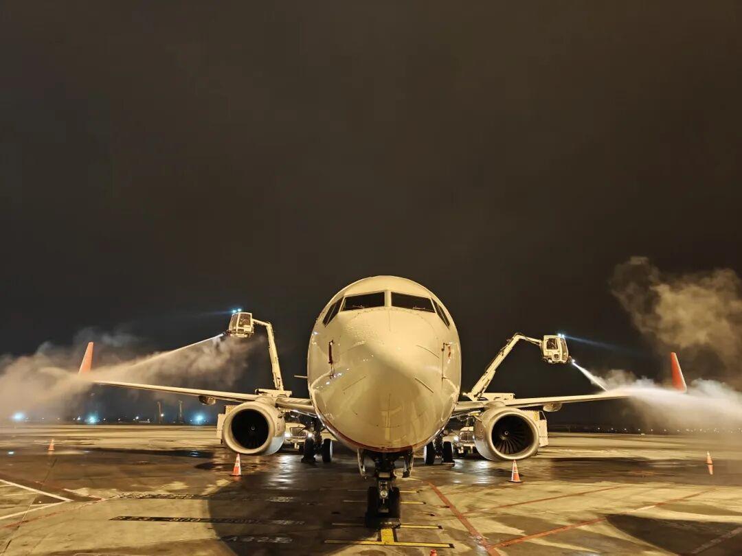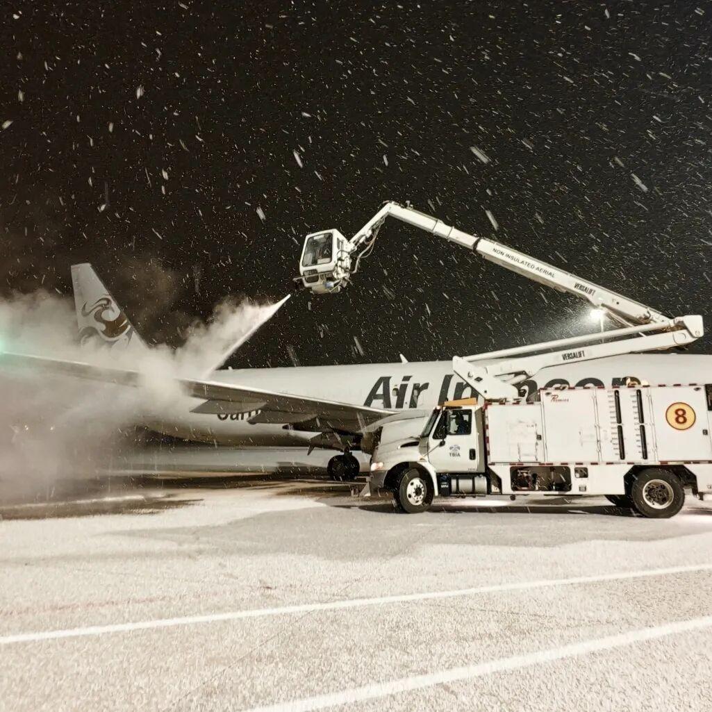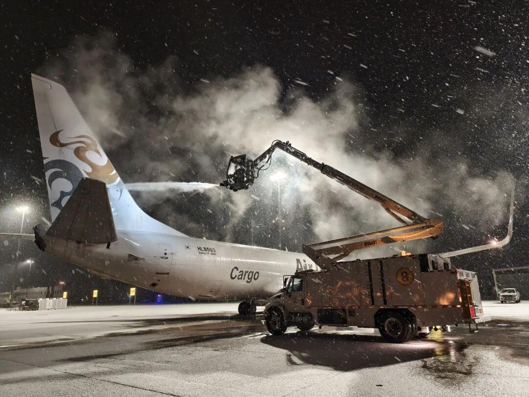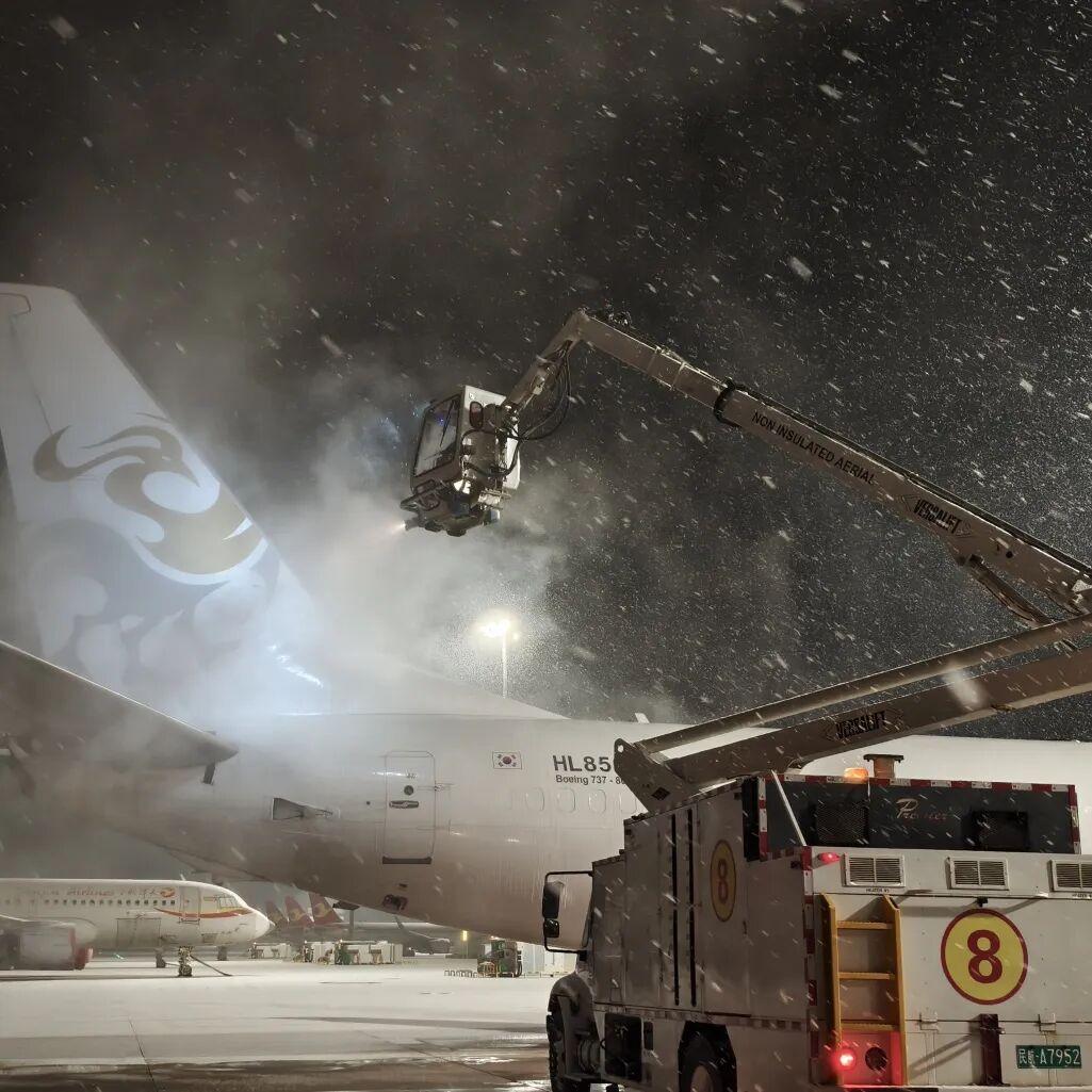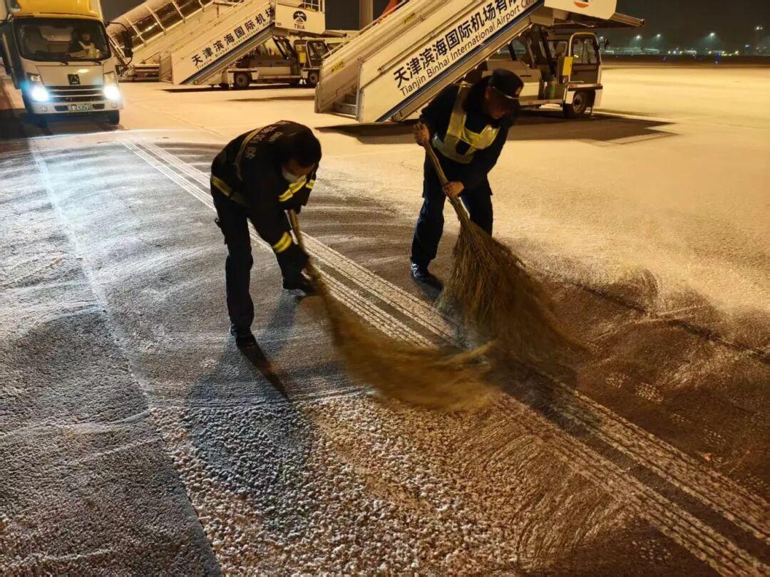 为保证航空器适航,12月12日晚10时,天津滨海机场集结保障人员百余人、9部除冰车,于13日00时13分开始进行航空器除冰雪作业,降雪期间,天津滨海机场共计完成航空器除冰雪17架次。