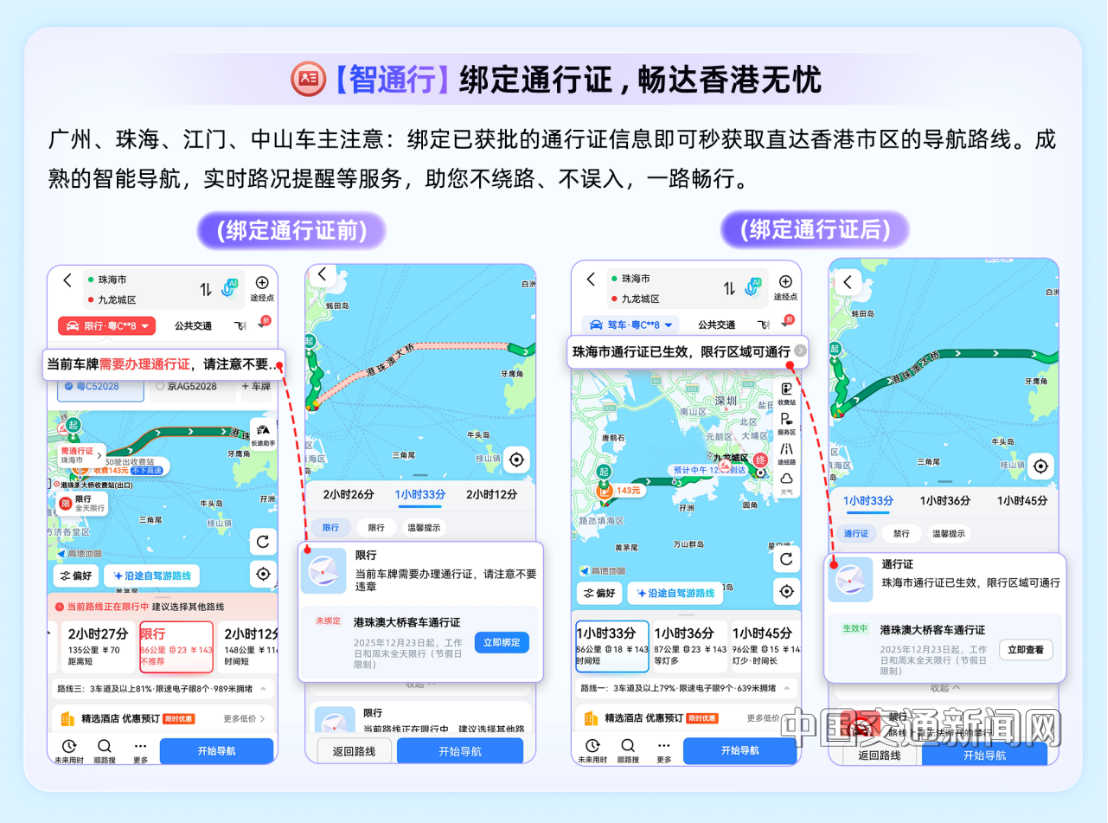 据悉,获批的用户可通过高德APP,绑定已获批的通行证及车牌信息”,便可秒获专属跨境导航路线。其通行证管理功能集成了粤港两地通行规则并自动关联,实行“一车一策”的路线规划,跨境导航全流程贯通,“一键”直达香港。