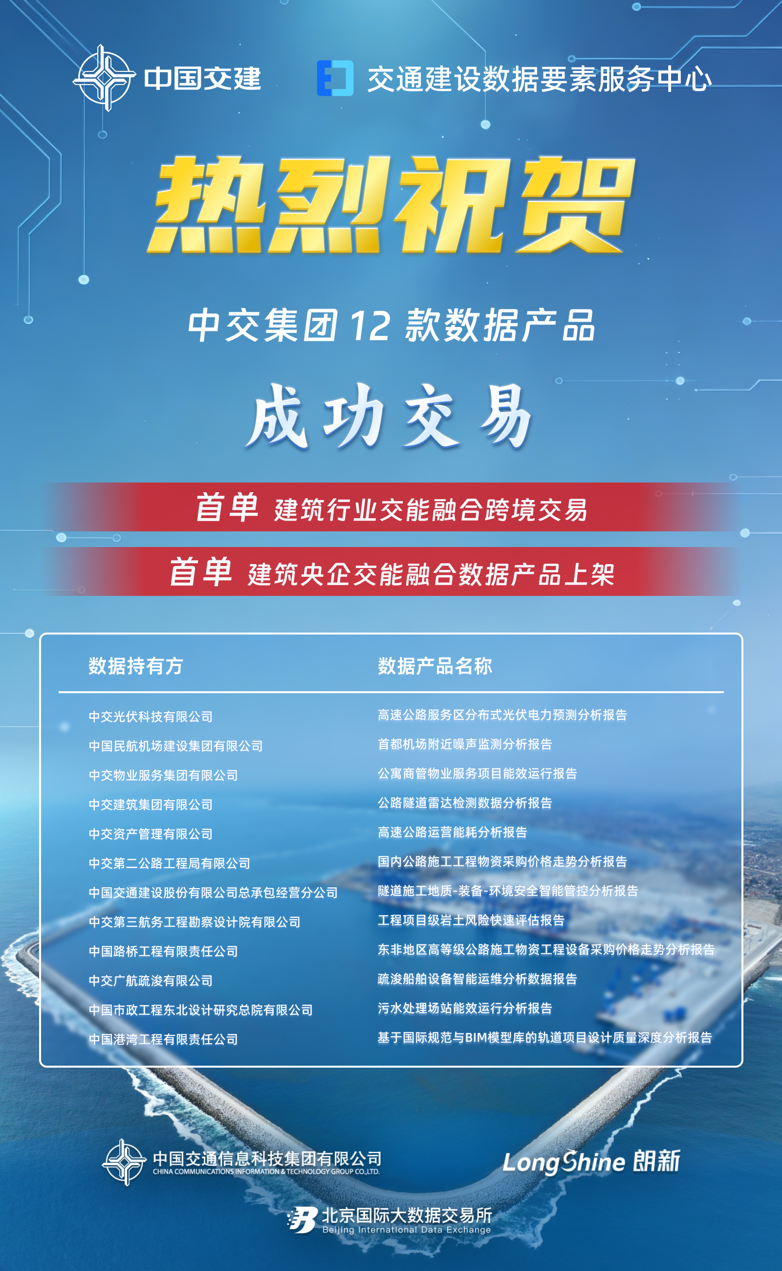 近日,由中国交通信息科技集团有限公司(简称中交信科)牵头打造的交通建设领域首单数据报告形态产品成功落地交易。此次交易经北京国际大数据交易所(简称北数所)合规审查,中交信科联合中交集团内部12家单位联合开发系列数据报告产品,正式售予朗新科技集团有限公司(简称朗新科技)。这一突破性成果不仅标志着交通建设数据要素市场化流通迈出关键一步,更为“数据要素×交能融合”的跨领域创新筑牢了坚实基础。