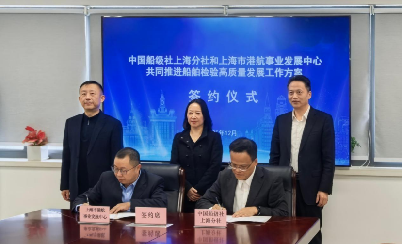 近日,中国船级社(CCS)上海分社与上海市港航事业发展中心签署了推进船舶检验高质量发展合作协议。上海市交通委海事处种治华副处长、上海市港航事业发展中心主任徐万毅、CCS上海分社副总经理潘忠兵出席签字仪式。上海市港航事业发展中心副主任丁越峰和CCS上海分社国内处处长沈剑代表双方签署协议。