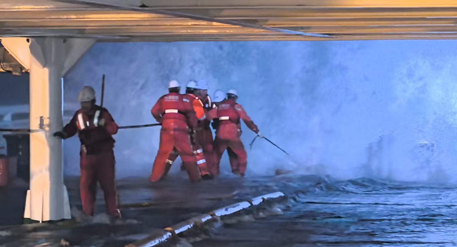现场海况比预报更为恶劣。救助船多次尝试靠近接拖,均因风浪过大、两船摇晃剧烈而失败,连固定好的缆绳也被巨浪打乱。面对极端海况,现场指挥果断决策:暂停冒险靠近,转为现场守护。救助船在遇险船附近顶风抗浪,保持安全距离,彻夜监控其动态,并通过高频不断安抚遇险船员情绪,告知救援决心与计划,给予他们坚定的信心与温暖。