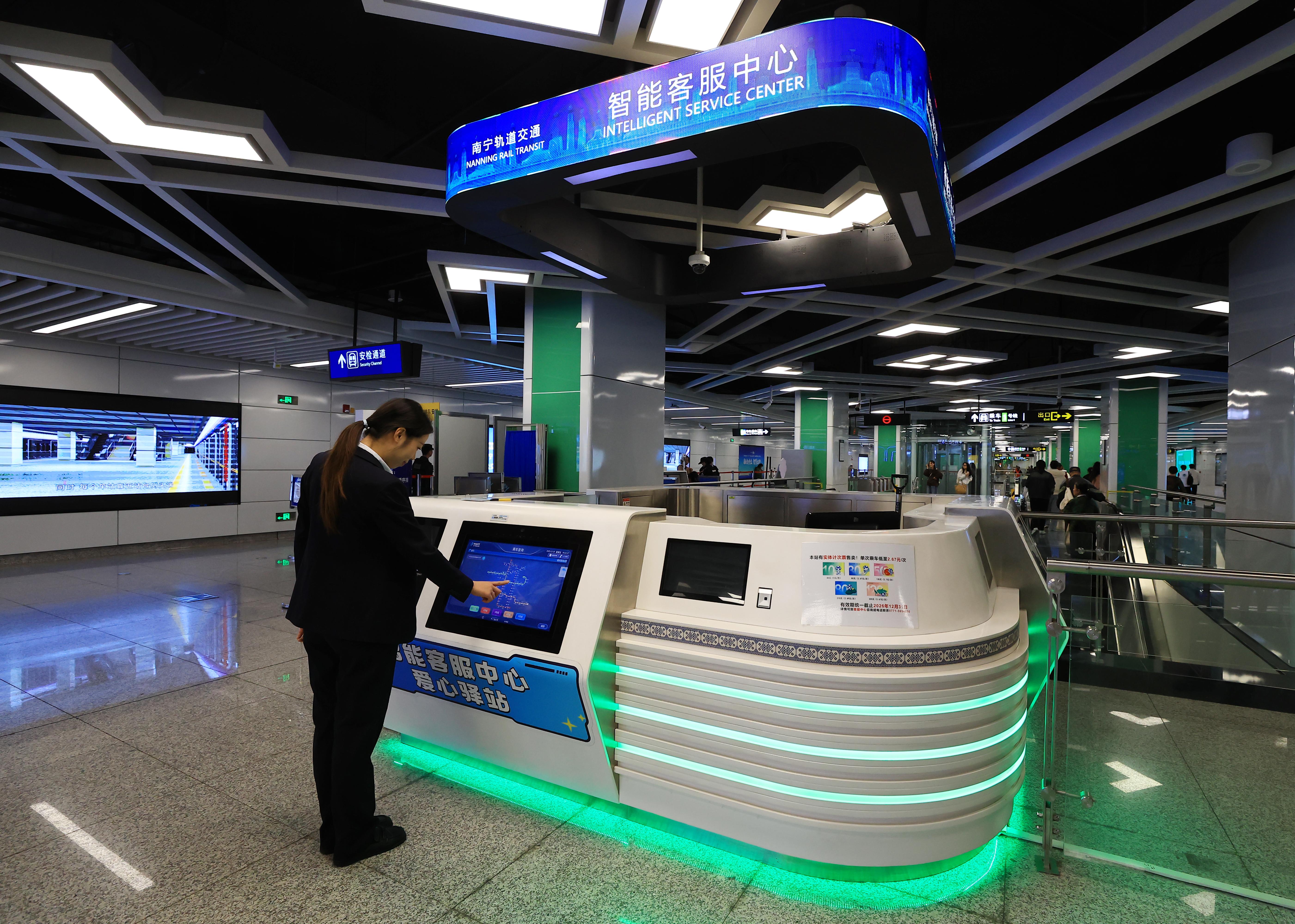 如果说协同智慧调度系统是“大脑”,遍布城市的智能应用便是其延伸的“手脚”,渗透到出行服务的每一个环节,重点枢纽的服务智能化升级让出行更省心。南宁火车东站依托先进大模型技术,打造站内一体化换乘引导系统,提供智能客服、高精度导航、个性化线路规划、公交地铁信息实时联动等服务。乘客通过智能终端,即可一键获取最优换乘路径、便民设施位置以及旅游资讯。在地铁5号线广西大学站试点上线的智能导乘系统,通过多媒体屏与触摸屏的组合应用,实现“进站—通行—换乘—出站—周边服务”全链条信息覆盖,乘客可查询实时列车动态、车厢拥挤度及公交接驳指引。