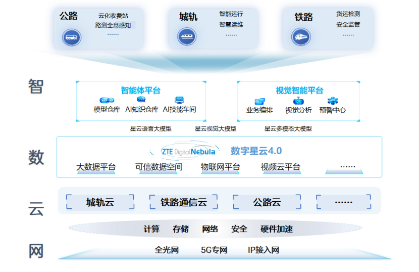 当前,我国正加快建设交通强国,云计算、大数据、人工智能等新一代信息技术正驱动交通基础设施的集约化、融合化、智能化转型,综合交通运输体系正经历从“规模扩张”到“质量提升”的深刻变革,对交通运输的运营质量、安全水平和运行效率提出了更高、更系统的要求。中兴通讯积极响应国家战略,将前沿技术转化为可落地的行业解决方案,以新质生产力构建交通运输新范式,围绕业务流,打通数据流,激活智能流,依托自身网、云、数、智的全栈核心能力,以云平台和数字星云为核心构筑交通数智大脑,打造开放解耦的智慧交通数智底座,全面驱动效率提升与服务创新。