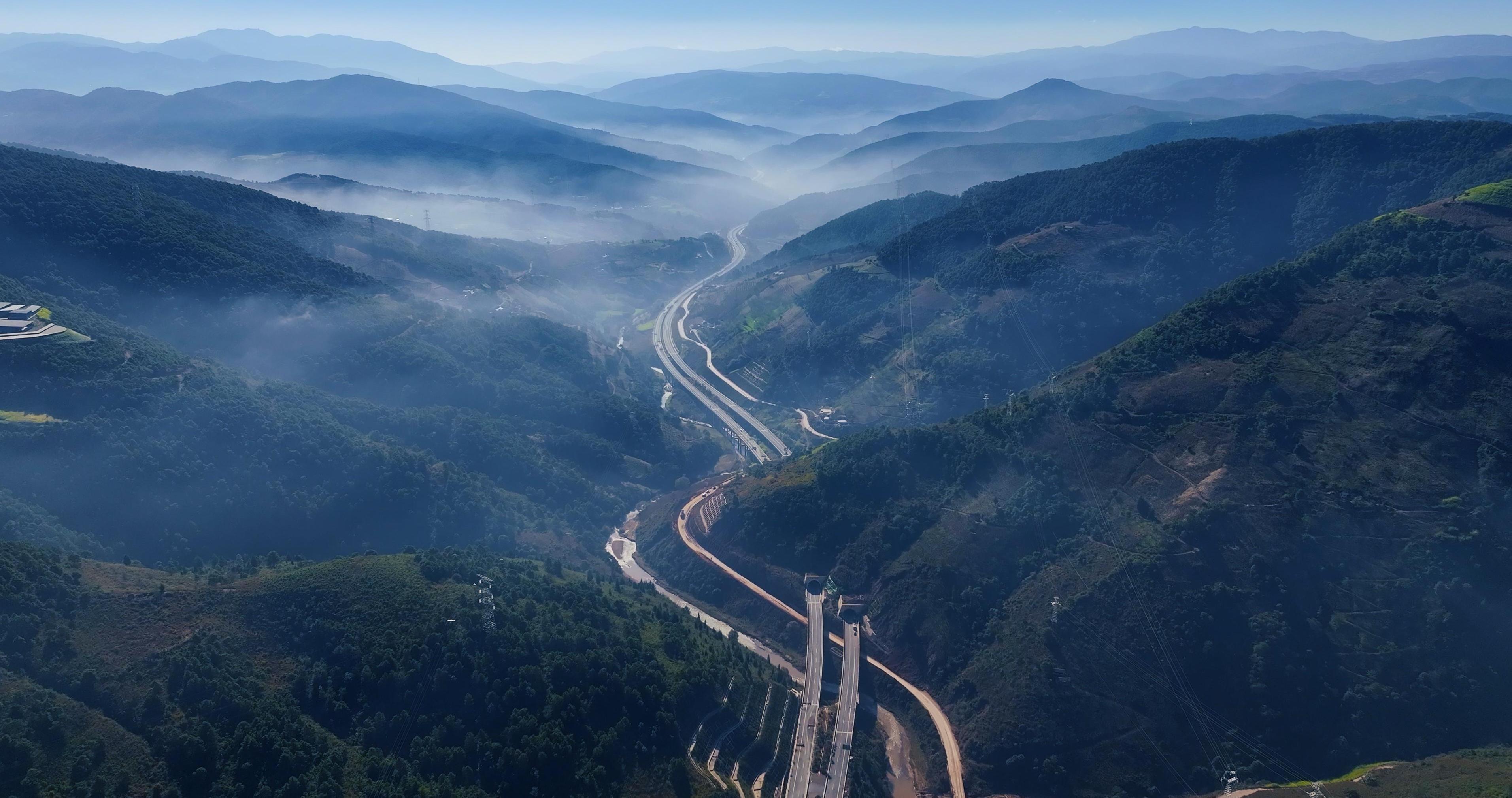 博南古道旁,一条银灰色的高速公路破雾穿云、蜿蜒山间,宛若游龙横贯群峰。这就是永昌高速公路——一条承载希望、连通未来的现代交通大道。