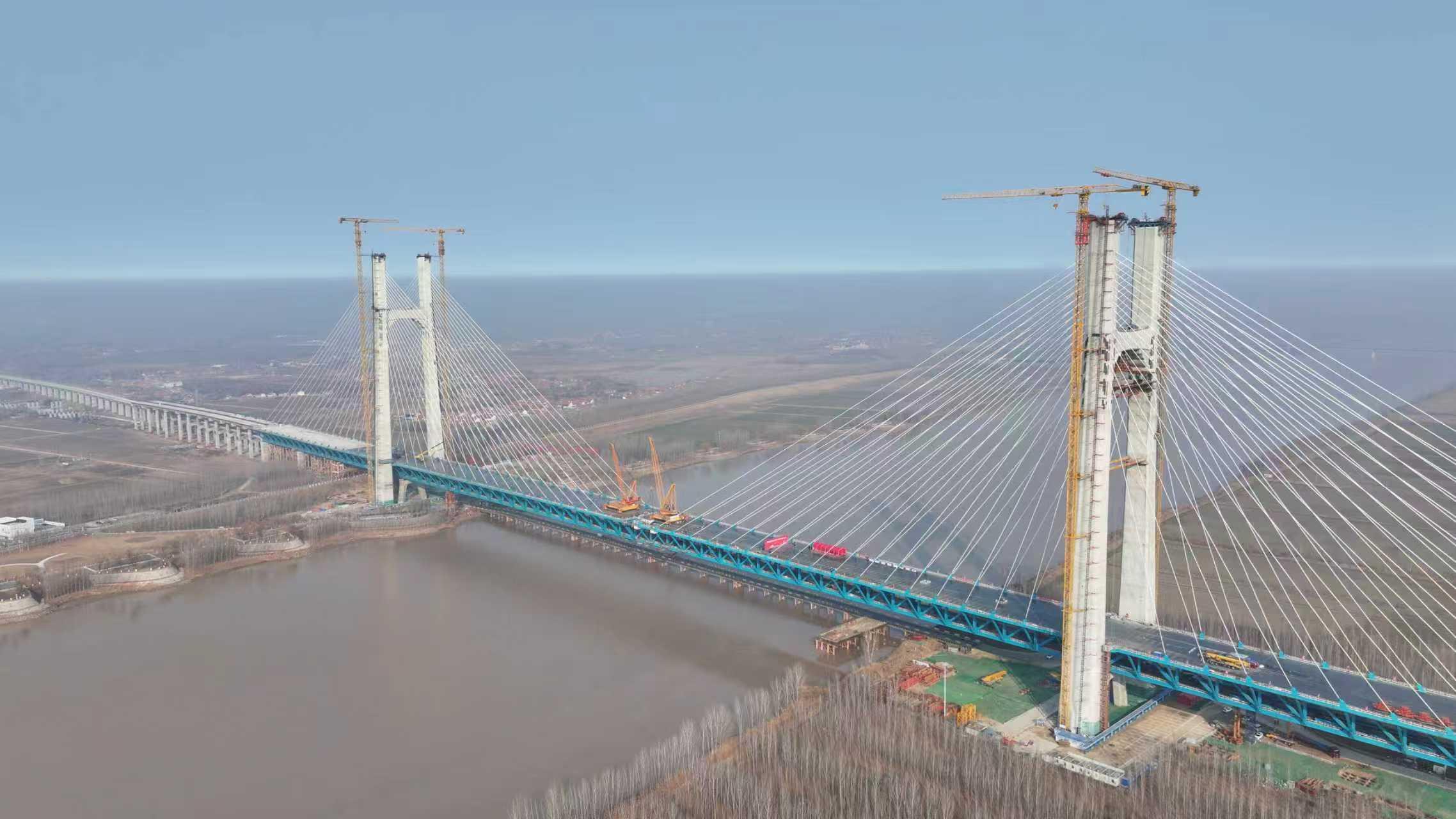 尤为值得一提的是黄河公铁大桥本身。受黄河不通航等限制,4.92万吨钢梁需在现场“散件散拼”。建设者采用两台75吨大型架梁吊机,像“搭积木”一样,将84个巨大节段从两端向中间精准拼接,并于去年9月提前8个月完成两座203.6米高的主塔封顶,为最终合龙奠定基础。大桥还创新取消传统下横梁,采用刚架结构,既优化受力,又节约工期,展现了我国桥梁建造的先进水平。