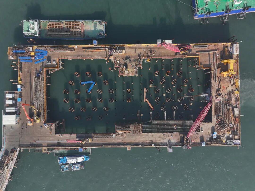 如果说桩基决定了承载力,那么承台就是跨海桥塔的真正“基座”。西主塔承台外围设立的双壁防撞钢套箱,可作为承台干施工的围护结构,更重要的是,该结构将作为永久性防护设施,在桥塔成型后长期守护大桥整体结构安全。钢套箱高11.7米、长105.8米、宽47米,面积相当于7个篮球场,重达4225吨,是国内最重的跨海大桥永久双壁防撞钢套箱,形如海上“钢铁巨盾”。