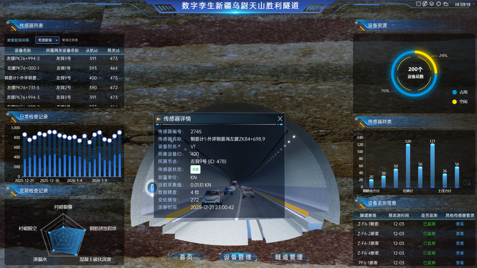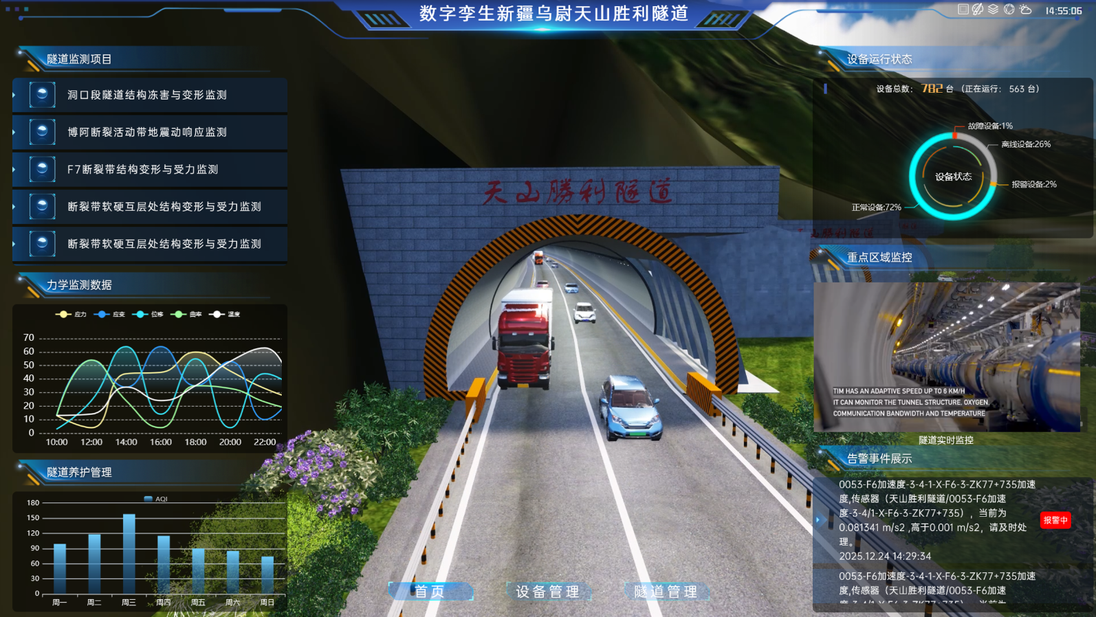 面对天山胜利隧道超长、地质环境极端复杂、运营维护难度巨大的特点,团队直击行业痛点,借助现代信息化技术,解决隧道界普遍存在的智慧化程度低和可靠性差的问题,实时掌控隧道工作环境状况和服役状态,实现结构预警评估信息化。