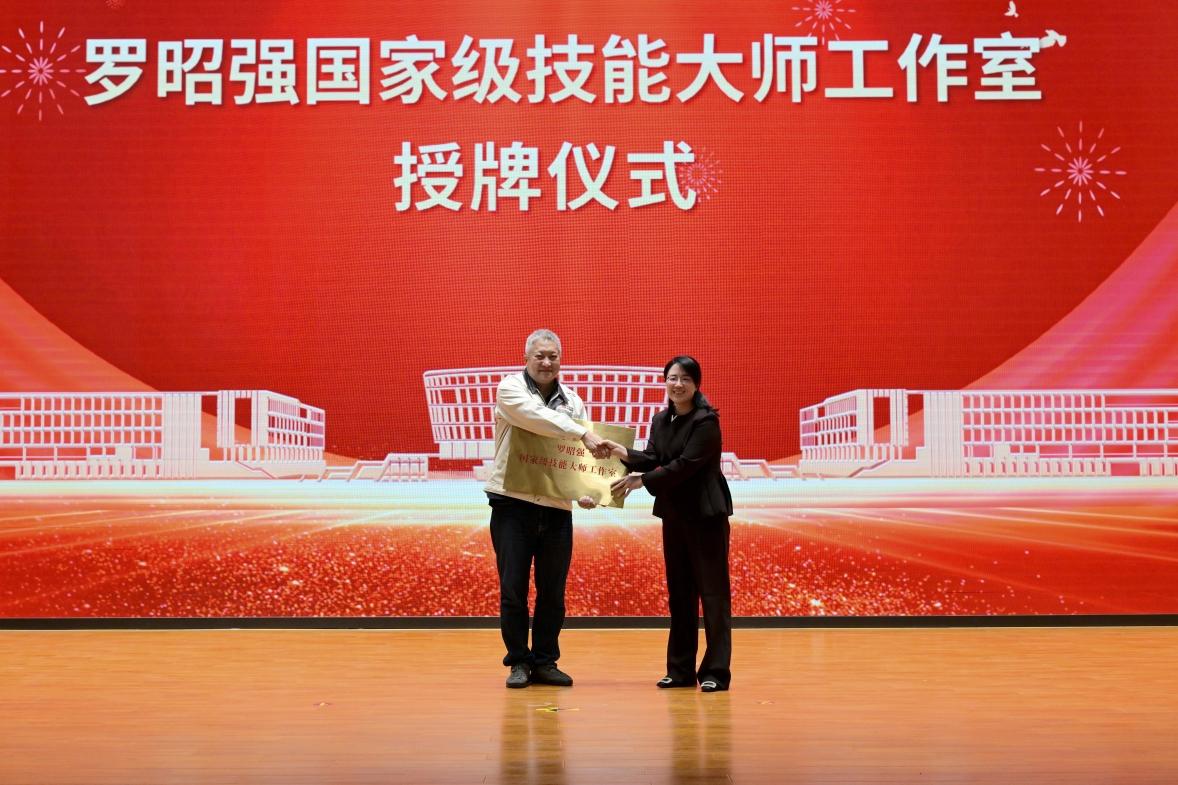 活动现场举行了罗昭强国家级技能大师工作室授牌仪式,涂晓嫔院长亲自为工作室授牌,也为这场兼具仪式感与号召力的活动拉开序幕。在随后的专题讲座中,罗昭强大师以“自强不息 锚定未来 铸就精彩人生”为题,结合自身从普通工人到大国工匠的奋斗轨迹,倾情分享逐梦匠心、实现人生蜕变的精彩历程,勉励同学们珍惜优质学习资源,潜心钻研技术技能,用精湛技艺书写人生华章。