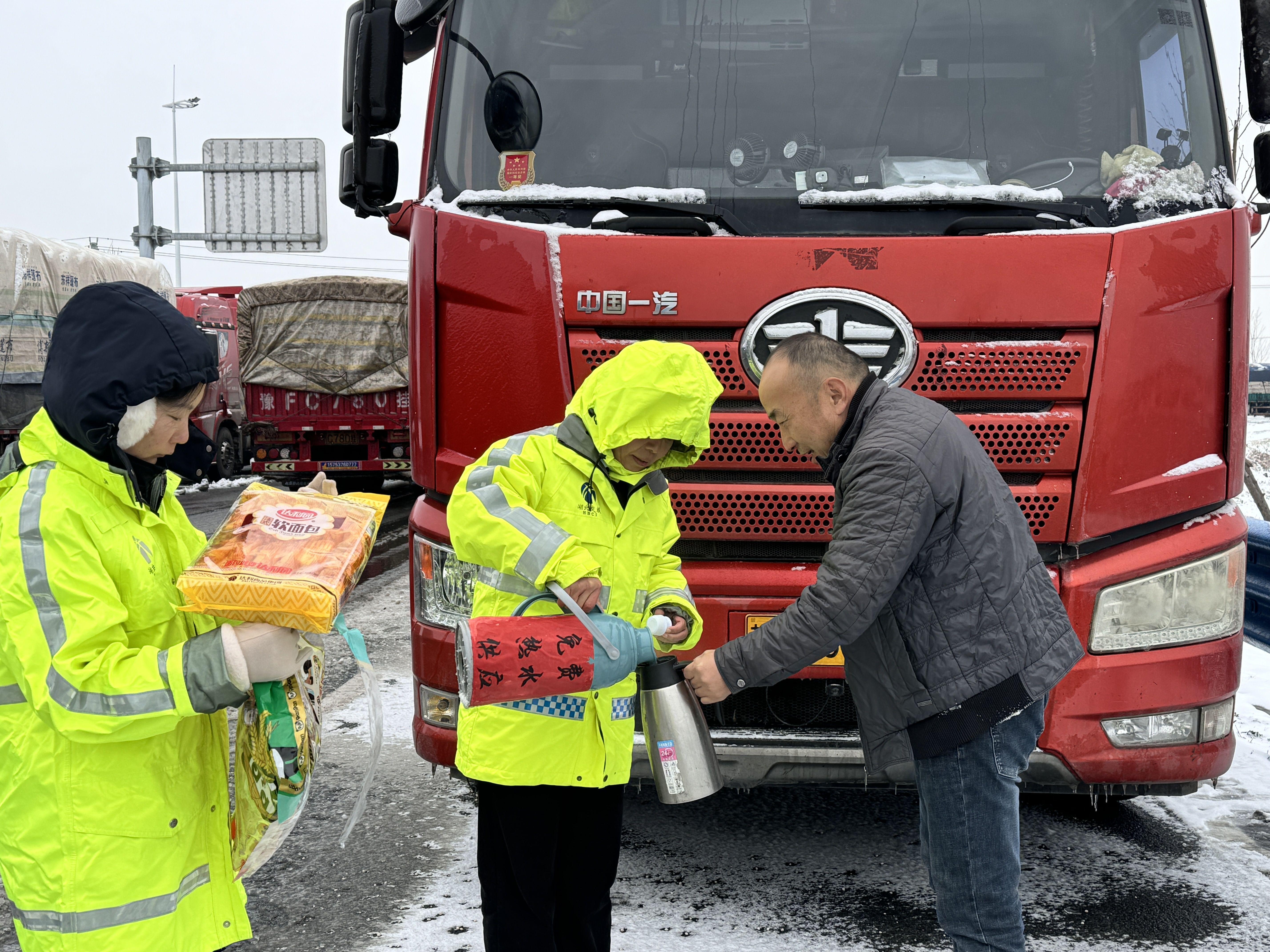 针对因天气原因滞留或缓慢通行的车辆,工作人员穿行于车流之间,主动靠前提供“敲窗”服务,耐心解答司乘询问,安抚焦虑情绪,及时送上热水、方便食品与面条等物资,将暖心关怀送至每一位司乘的心坎上。一杯杯热茶、一份份简餐,不仅驱散了冬日的寒意,更温暖了奔波在途的人心。一位受助司机由衷感叹:“风雪这么大,看到你们忙碌的身影,心里就特别踏实!”