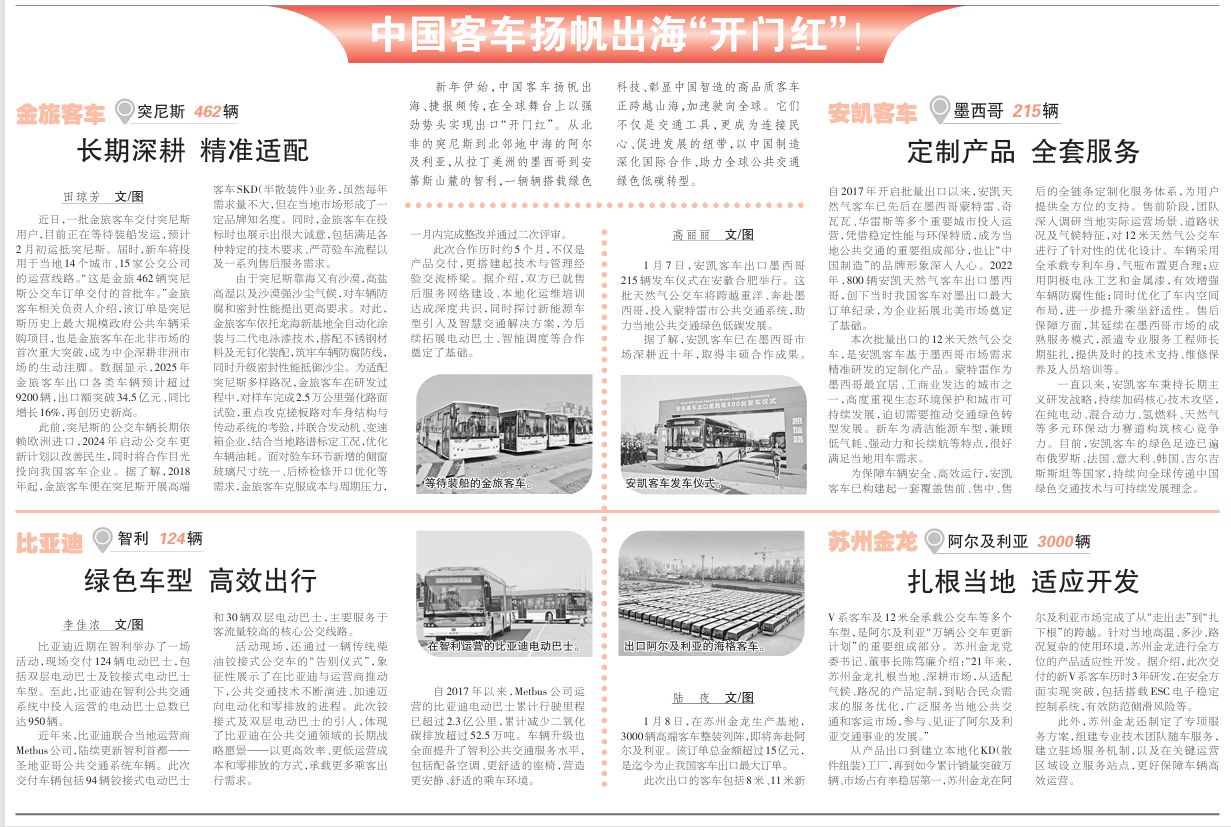 新年伊始,中国客车扬帆出海、捷报频传,在全球舞台上以强劲势头实现出口“开门红”。从北非的突尼斯到北邻地中海的阿尔及利亚,从拉丁美洲的墨西哥到安第斯山麓的智利,一辆辆搭载绿色科技、彰显中国智造的高品质客车正跨越山海,加速驶向全球。它们不仅是交通工具,更成为连接民心、促进发展的纽带,以中国制造深化国际合作、助力全球公共交通绿色低碳转型。