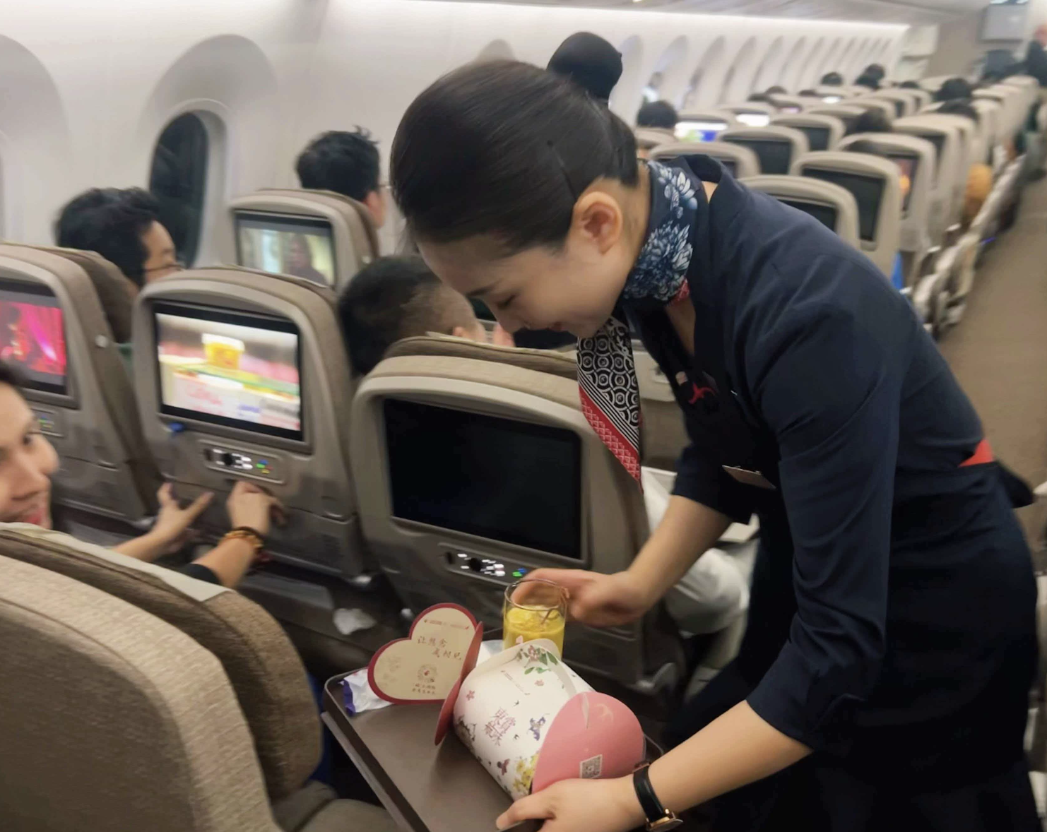 全球最长航线的首航记忆,是两人心中共同的温暖印记。张梦滢还记得,首航航班上,乘务组听闻有一对去度蜜月的旅客,特意准备了蛋糕和香槟,看着他们幸福合影的样子,她忽然觉得,自己的工作不仅是守护旅途,更是发现美好。鲁倩则对一位“飞友”印象深刻:“他跟着首航航班去了布宜诺斯艾利斯,在机场晃了一圈又跟着我们回程,全程50多个小时几乎兴奋地没合眼,他还很感谢乘务组,说能全程体验首航,是一种缘分。”