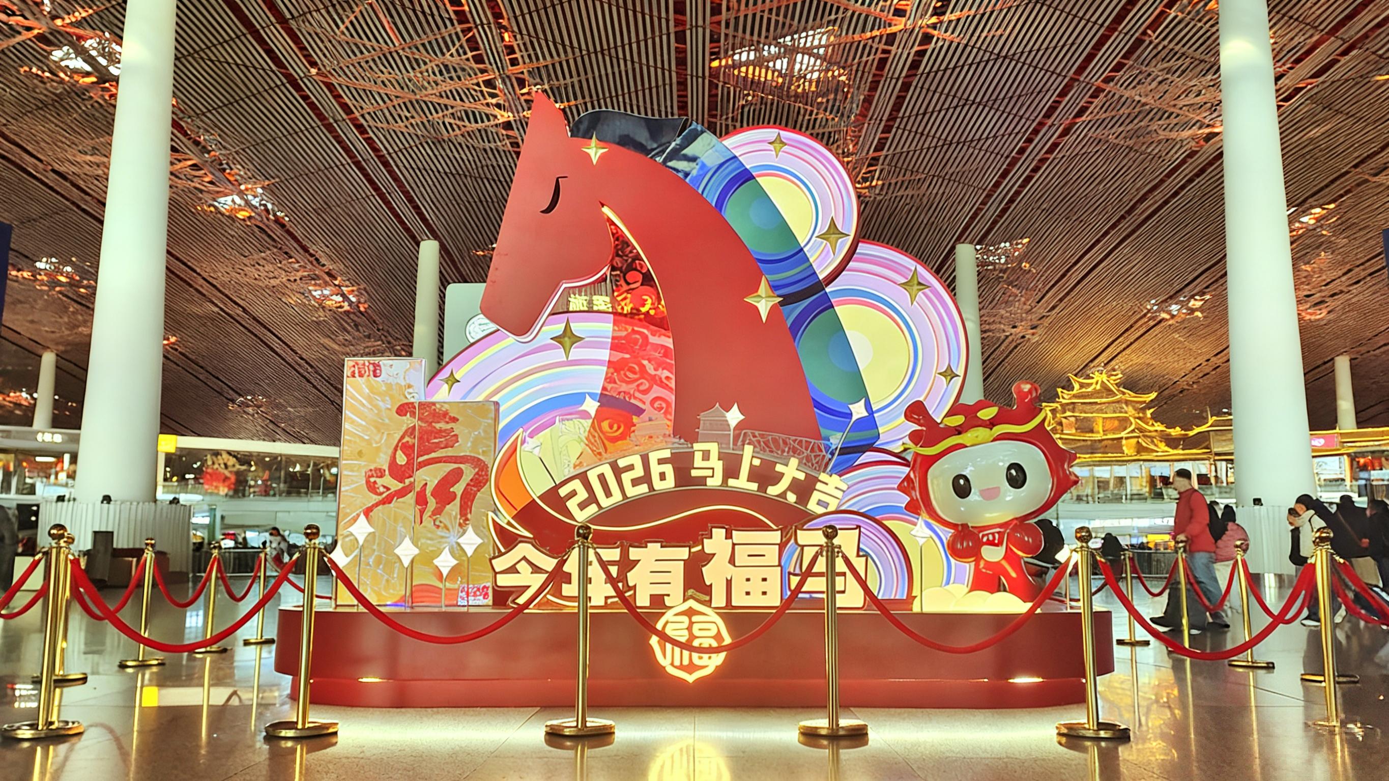 现在,走进首都机场航站楼,精心设置的新春景观让节日氛围扑面而来。其中,3号航站楼以“天马”主题呼应汉代“天马为龙使”的文化内涵,象征连接世界;2号航站楼塑造“日历新篇”景观,融入剪纸风格马年图案与北京剪影,寓意新年启程、时光焕新。首都机场还在车道边、值机区等区域张贴了马年主题窗花与装饰贴纸,向过往旅客传递温馨的新年问候。