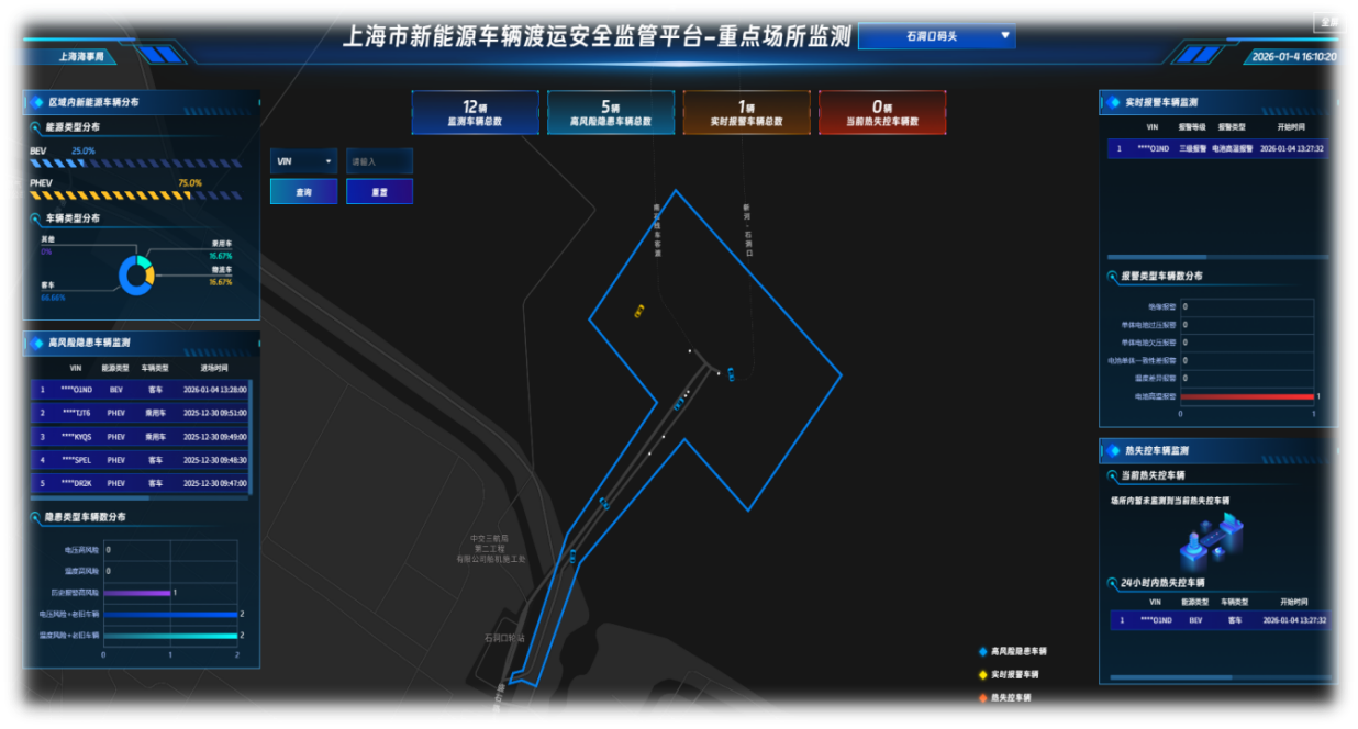 立足春运安全保障实际,上海海事局与上海市大数据局联合相关单位深入调研,充分依托上海市新能源汽车公共数据资源,构建起全流程数字化监管体系。平台通过在车客渡码头港区部署电子围栏,自动抓取进入区域的新能源车辆品牌、车架号、电池健康状态、历史报警记录等关键信息,借助风险评估算法模型筛选历史高风险车辆,同时对进场车辆进行实时监控,实现风险精准研判。更以“无感化服务” 为核心,建立 “数据采集→风险评估→自动预警→现场处置→结果反馈” 的闭环管理机制,实时将预警信息同步至海事执法人员和客轮公司,在车辆登轮前筑起“电子哨兵”防线,既保障安全又不影响旅客出行效率,由之前通过人力对车辆底盘电池检查转变为现在的“无感化”线上监测,车辆排队时间大幅缩短到之前的50%。截至目前,平台已接入上海各类新能源汽车 165.81 万辆,覆盖 160 多家车企、180 多个品牌和 2500 多款车型,春运首周已累计完成数千辆次新能源车辆风险筛查,精准拦截高风险车辆,守护了数万旅客的平安出行。