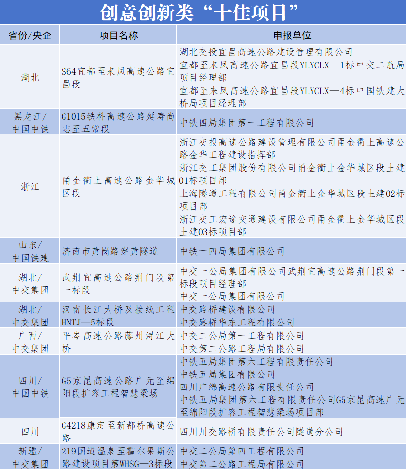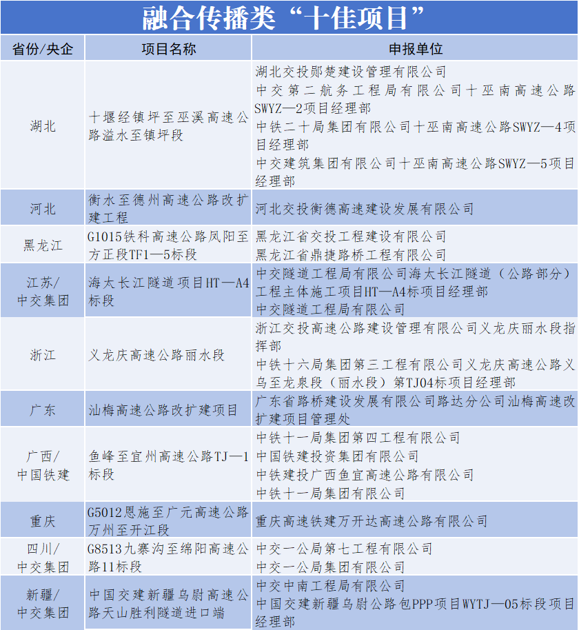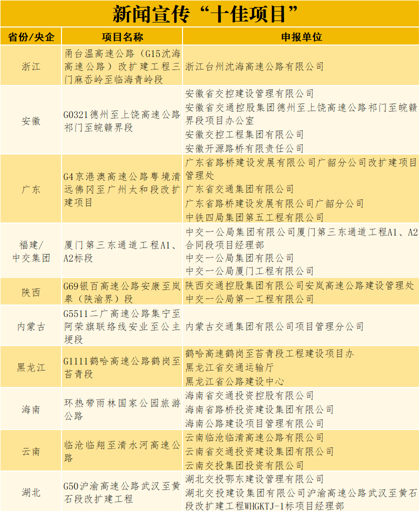 日前,由中国交通报社与交通运输部公路科学研究院、中国交通报刊协会联合主办的2025年公路重大工程新闻宣传“优秀项目”征集展示活动完成终审,来自交通运输部有关司局、科研院所、社会团体等单位的专家组成评审委员会,选出公路重大工程新闻宣传“十佳项目”10个、主题策划类“十佳项目”10个、融合传播类“十佳项目”10个、创意创新类“十佳项目”10个,以及“优秀项目”10个。
