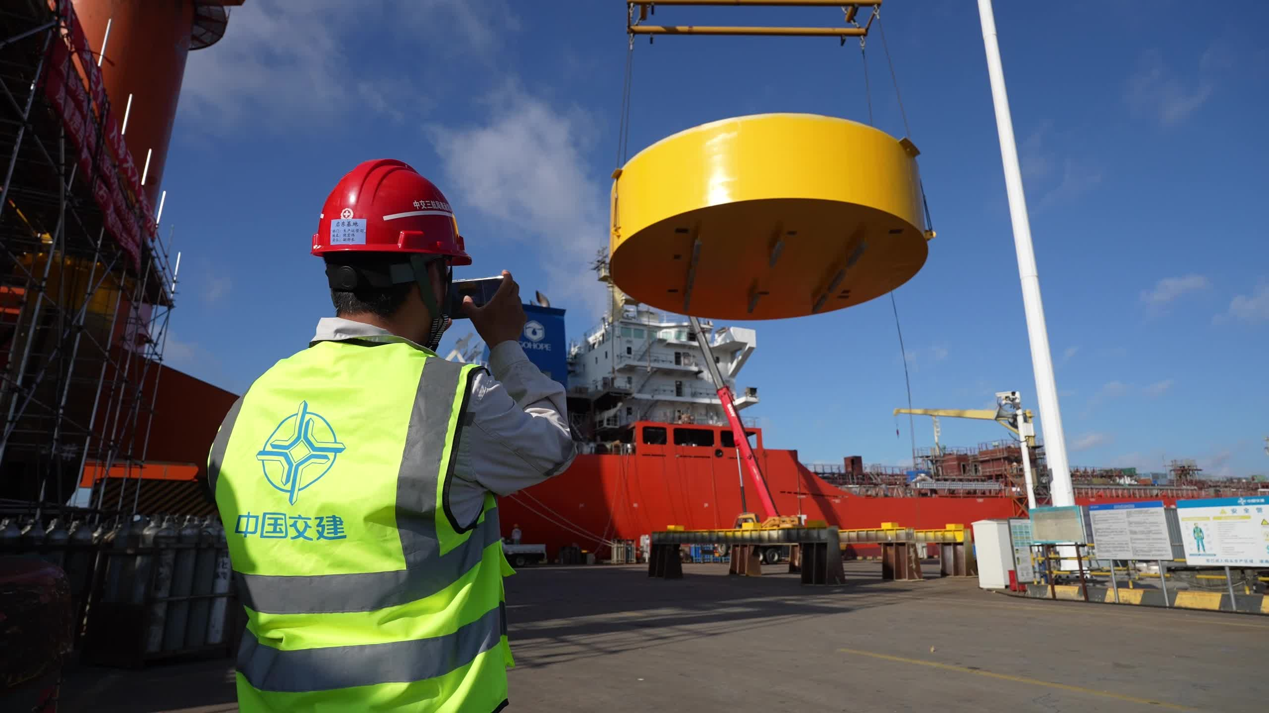 数据舱建设阶段是一场空间与高温的较量。在中交三航局南通海洋公司启东基地,一线温度近40摄氏度,直径仅14米的狭窄筒体内,测量、定位、组对、焊接,多层平台安装作业容不得半点偏差。