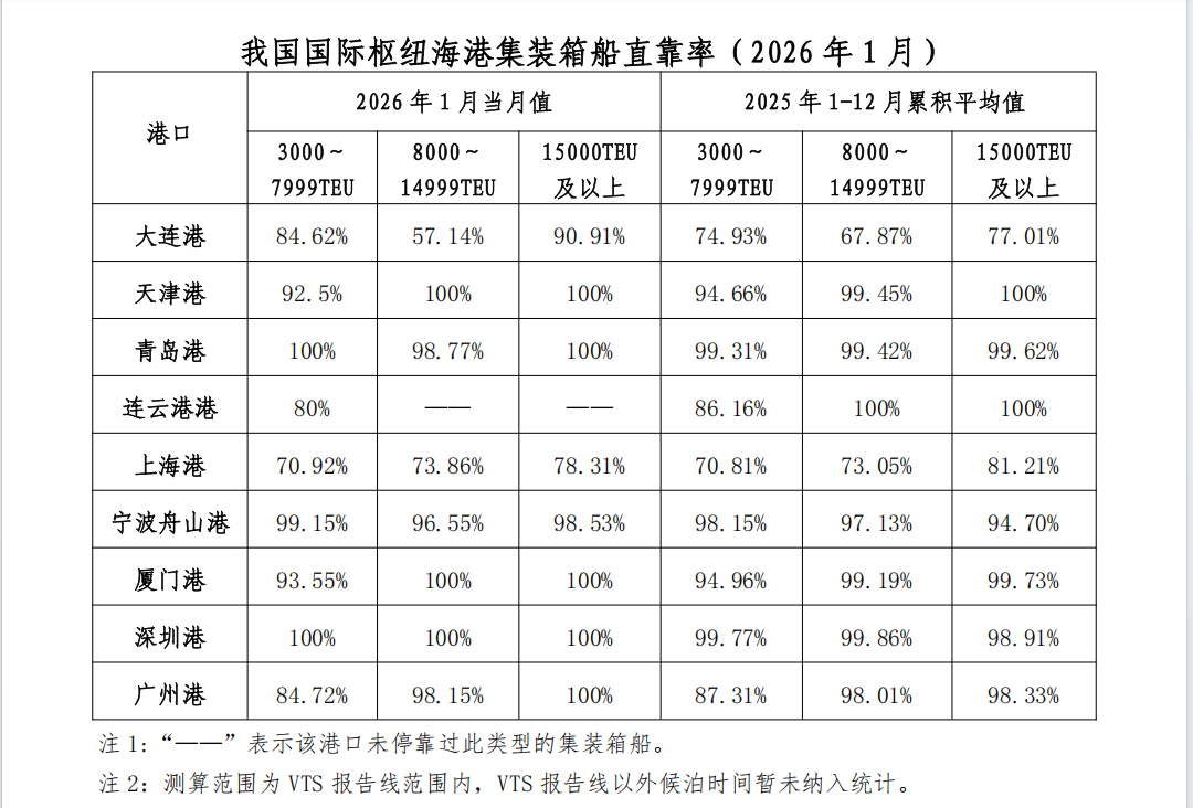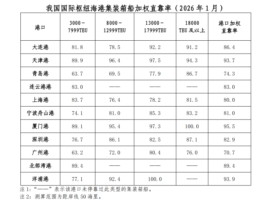 日前,中国交通报联合交通运输部北海航海保障中心,共同发布2026年1月我国国际枢纽海港集装箱船直靠率与加权直靠率数据,为港航业高质量发展注入精准数据动能。其中,加权直靠率数据系首次发布。