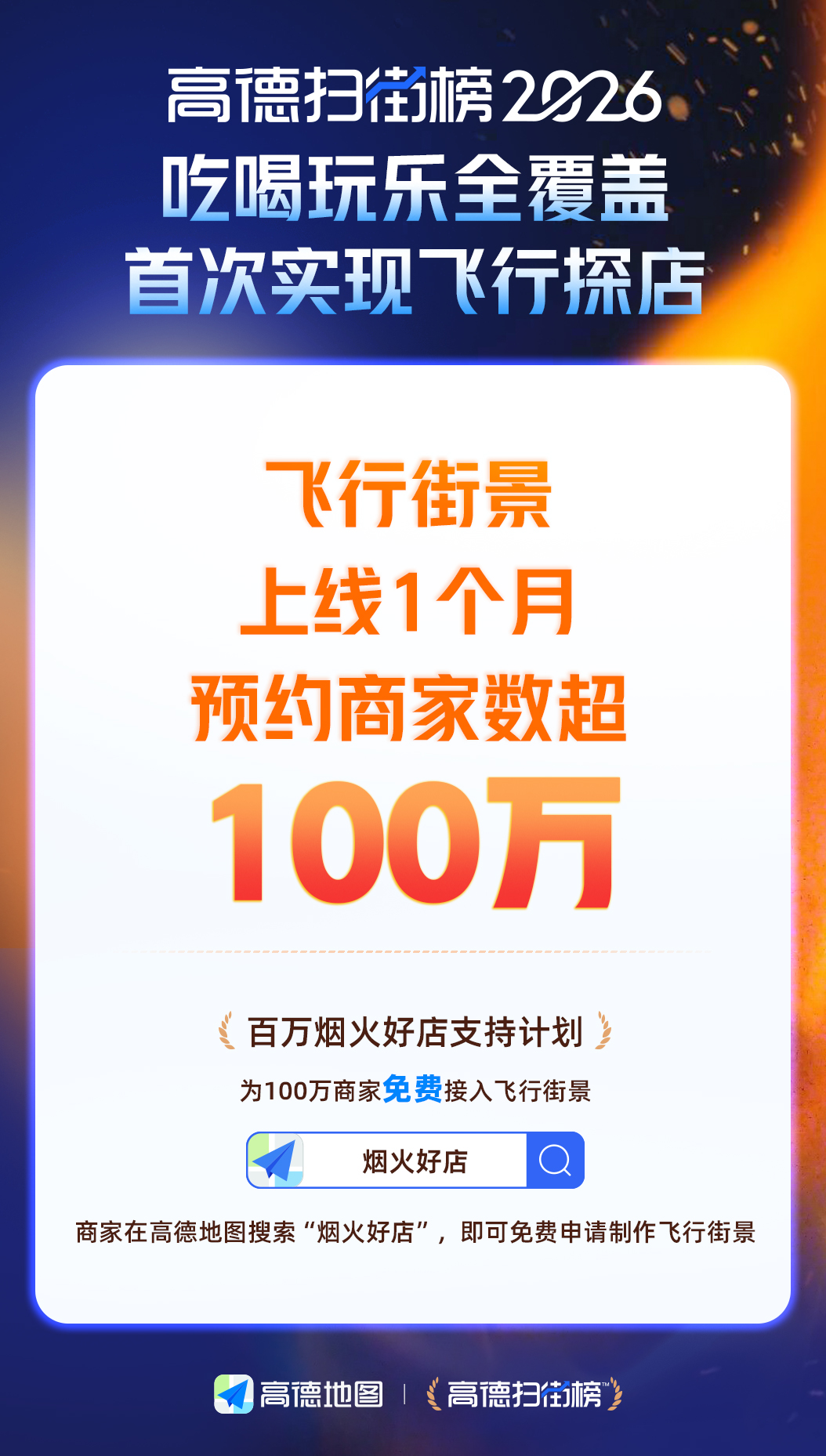 据高德扫街榜负责人介绍,为支持商户在春节期间降本增效,扫街榜推出了专项激励方案:新开通“飞行街景”的商户,最高可获得价值20万元的广告流量激励及相关权益,旨在鼓励更多中小商户拥抱AI数字化经营。截至目前,全国申请预约开通该功能的商家已突破100万家。