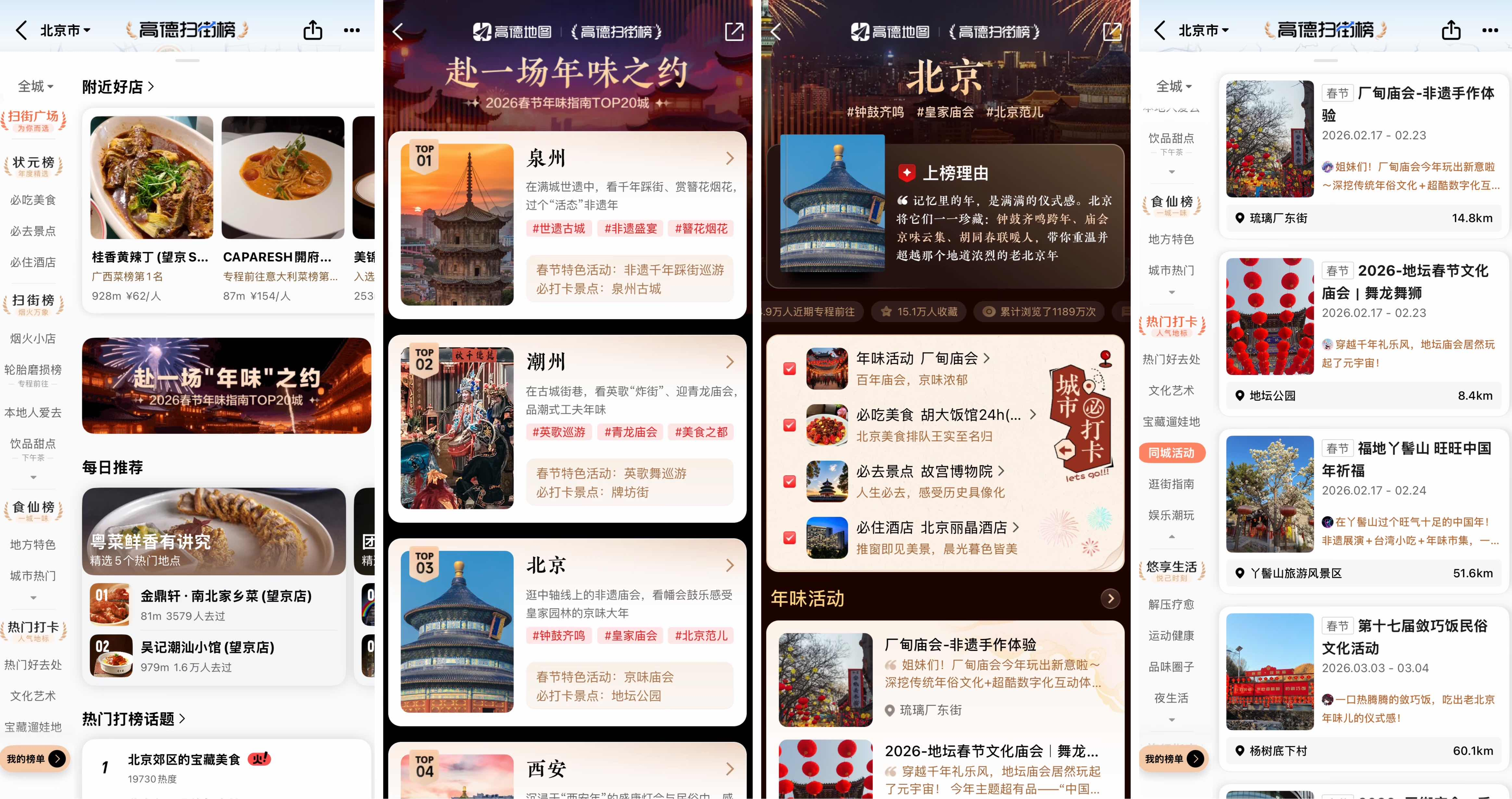 针对春节多元化的出游需求,高德扫街榜基于平台真实出行大数据,筛选出最具本地特色的体验点,正式发布“2026春节年味指南”,聚焦北京、西安、泉州、潮州、哈尔滨、广州等20个年味浓郁的热门城市,为用户提供吃喝玩乐一站式的消费决策指引。