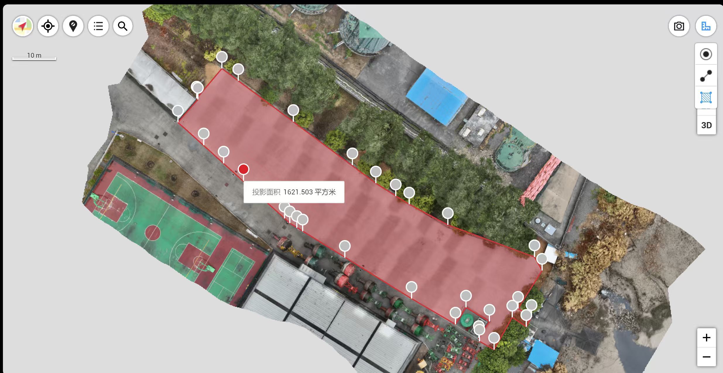 以往,户外工程面积测量多依赖于人工持GNSS接收器徒步采集边界点,效率较低且在复杂地形中存在安全与精度风险。此次,福州航标处技术团队操作无人机,沿工程边界自动飞行,通过搭载的RTK模块与卫星的差分校正信号,实现了平面精度可达厘米级的连续、快速坐标采集。仅用传统方法十分之一左右的时间,即完成了全堆场区的高密度数据获取,并自动生成精确的施工面积核算报告。
