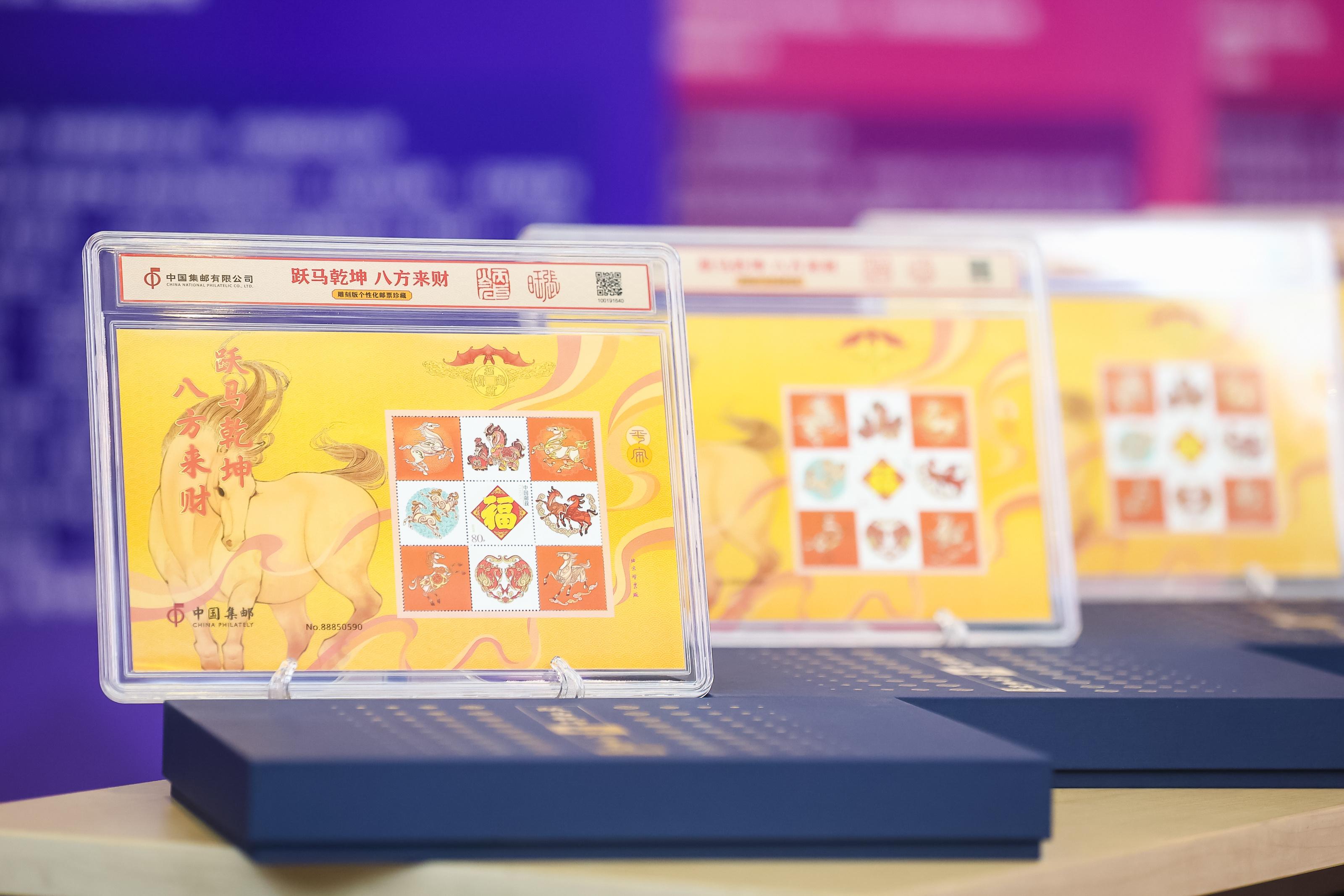 1月29日,中国集邮有限公司在京举办的“年货迎祥·骏驰纳福”《跃马乾坤 八方来财》年货节暨生肖产品发布会上,《跃马乾坤 八方来财》雕刻版生肖主题邮票珍藏摆件、《骏驰元宇》邮票珍藏册和多款年节礼品同步发售。