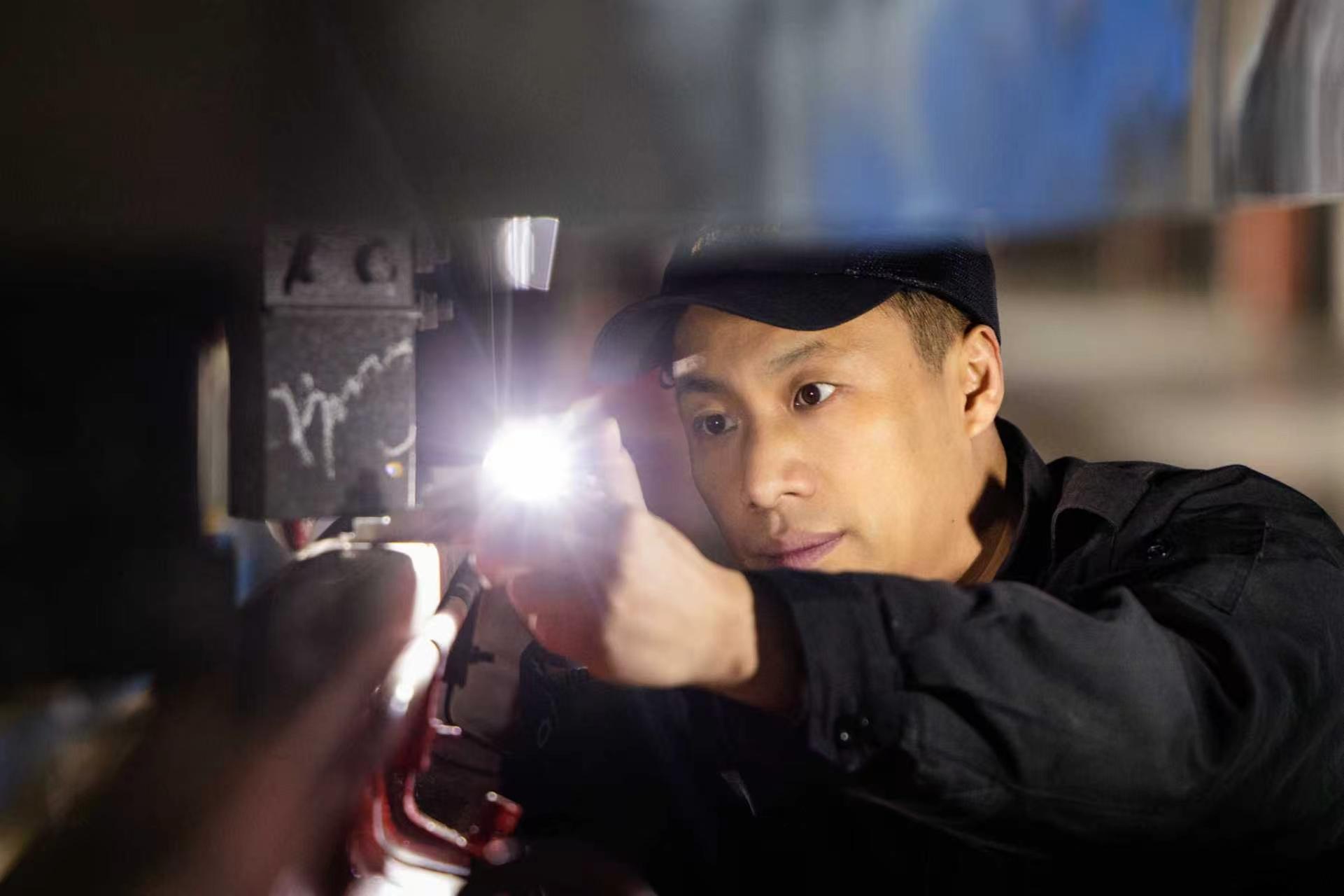 “检修地沟空间狭小,车底零部件复杂繁多,我们通常2人1组,1人1侧手持摄像手电筒,对走行部的零部件进行全方位检查。”马耀锋介绍,为保证检修效率和质量,每一次弯腰、抬头、俯身下蹲这些看似平常的动作,在检修作业时必须精准规范。