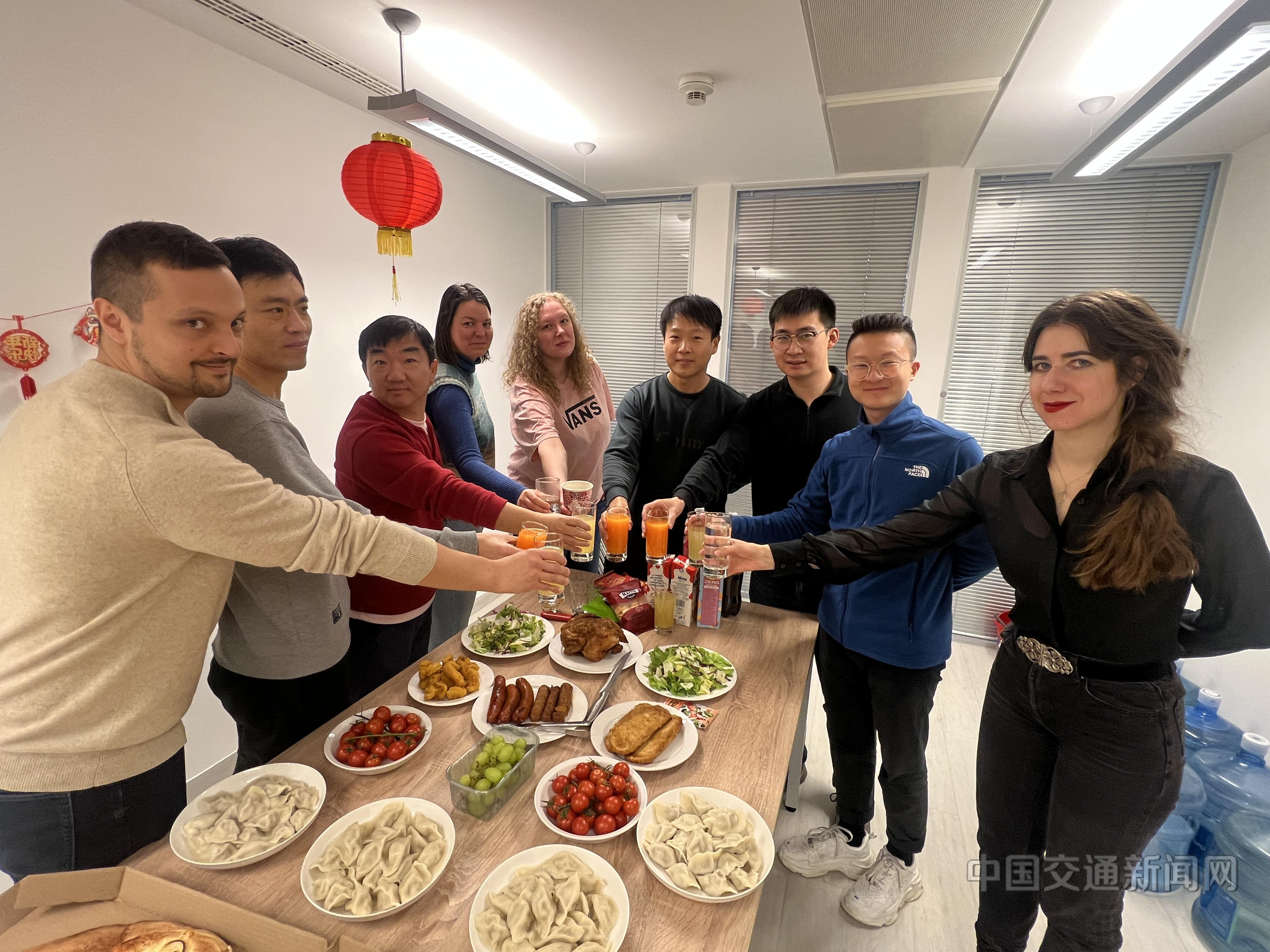 团队在推进铁路“硬联通”、技术标准“软联通”的同时,以新春为契机搭建中匈文化交流桥梁。春节期间,团队一边配合现场测试调试,一边与匈牙利员工携手共迎新春。中国铁设匈牙利分公司内,红窗花、福字相映成趣,来自匈牙利的员工学写“福”字,尝试包饺子,欢声笑语间,家乡味道让异国新春暖意融融。