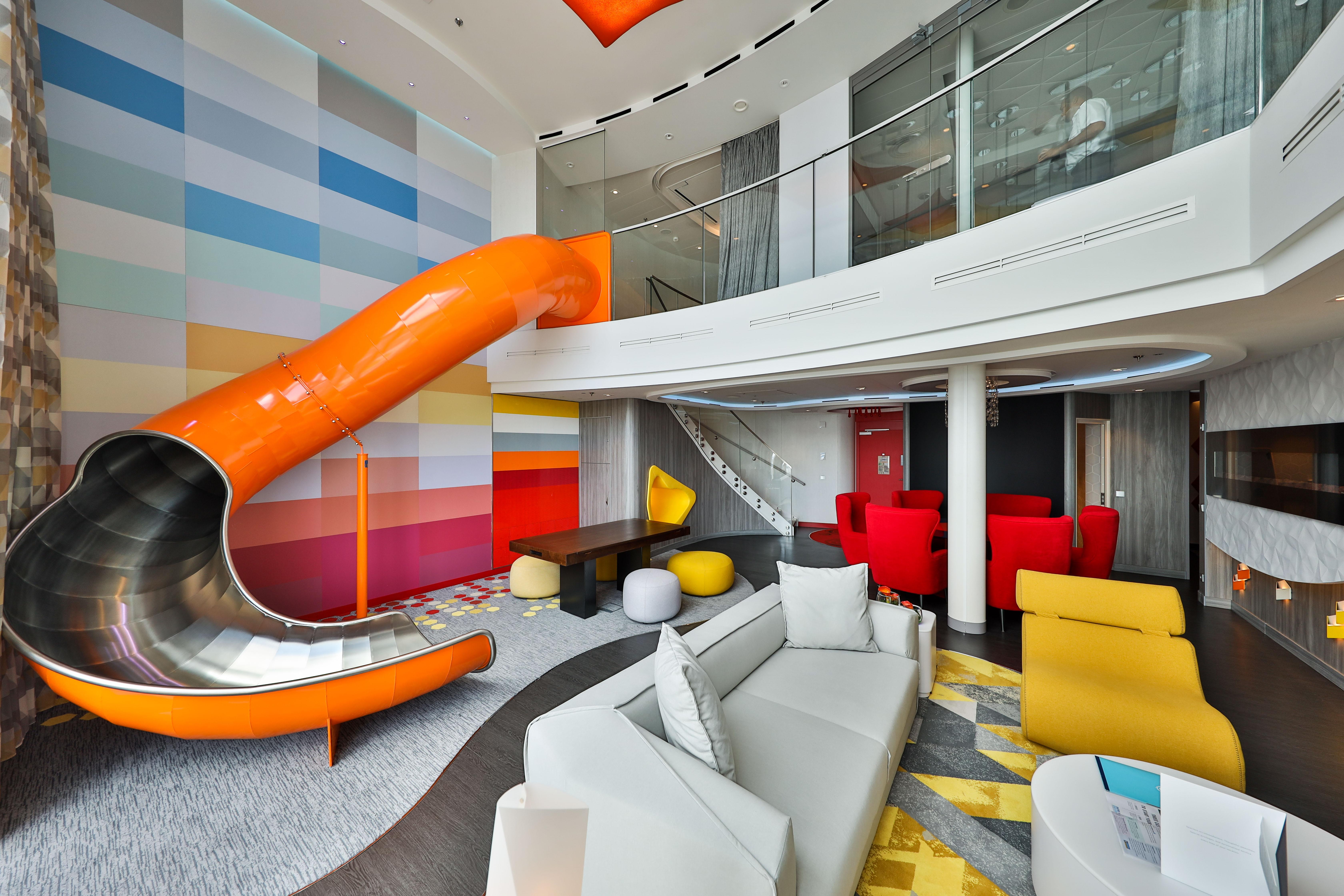 海洋光谱号“完美家庭套房”内置室内滑梯,最多可容纳11人。