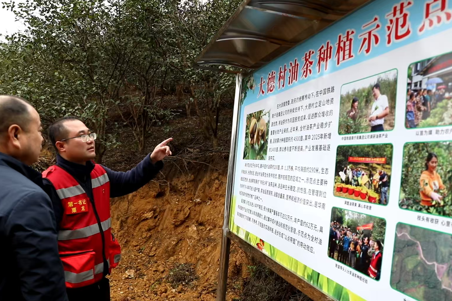在柳州市融水苗族自治县大浪镇大德村的千亩茶树地里,油茶叶青翠欲滴,村民们正忙着修剪茶树。田埂上,一位身着红色马甲的汉子正和村民们算着收成账,他就是中国铁路南宁局集团有限公司桂林工务段派驻大德村驻村第一书记粟龙。驻村一年间,他用脚步丈量土地,以真心服务群众,带领村民在乡村振兴的道路上步履铿锵,被大家亲切地称为“茶书记”。