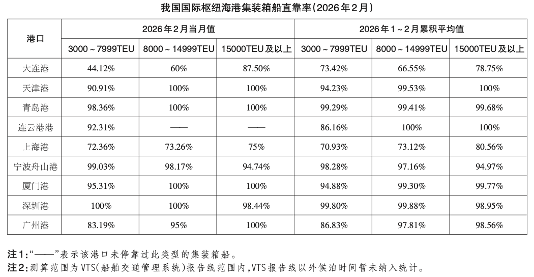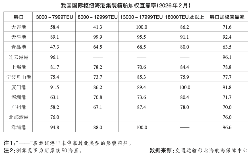 为客观评价我国港口服务水平,交通运输部北海航海保障中心组织开展了我国国际枢纽海港集装箱船直靠率和加权直靠率测算工作,现对外公布2026年2月我国国际枢纽海港集装箱船直靠率和加权直靠率数据,涵盖了大连港、天津港、青岛港、连云港港、上海港、宁波舟山港、厦门港、深圳港、广州港、北部湾港和洋浦港等11个国际枢纽海港。
