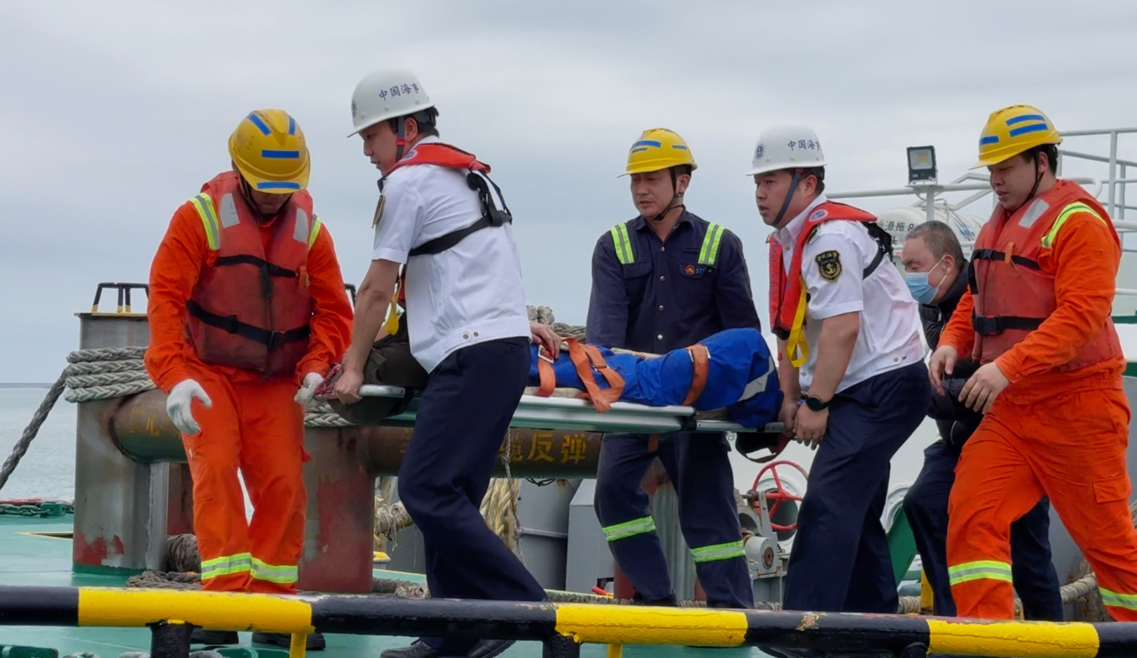 12时30分,“汕港拖8”船载着受伤船员到达广澳港码头,执法人员迅速登船,合力将受伤船员从船舱木板抬上担架,成功转移上岸送医救治。