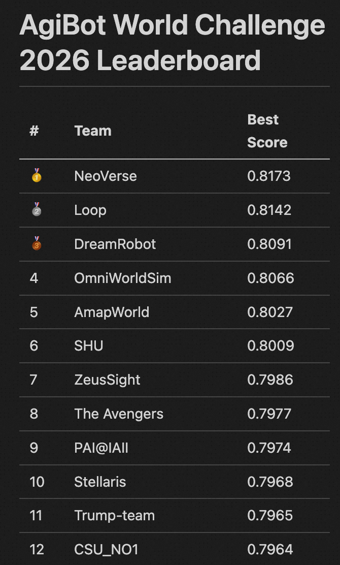 近日,在Agibot World Challenge 与 World Arena 两大国际权威评测中,中国Abot-world系列世界模型实现了双双登顶,谷歌、英伟达等海外顶尖科技公司均参加了本次评测。这标志着中国在具身智能核心基础能力——世界模型构建方面已经处于全球领先水平。