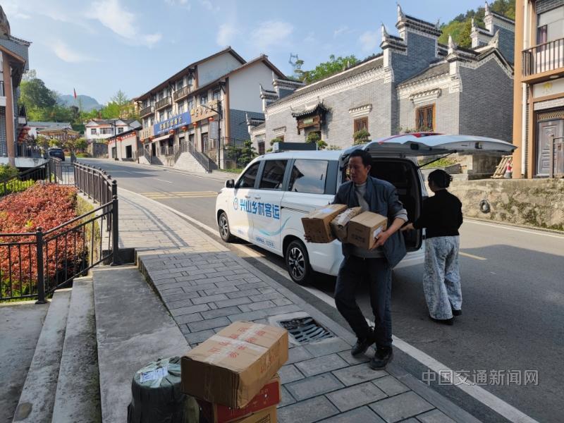 4月15日,湖北省宜昌市兴山县客货邮专线驾驶员周训福从峡口镇快递驿站取完快递,送到普安村村委会快递点(如图),村民在家门口即可拿到快递。