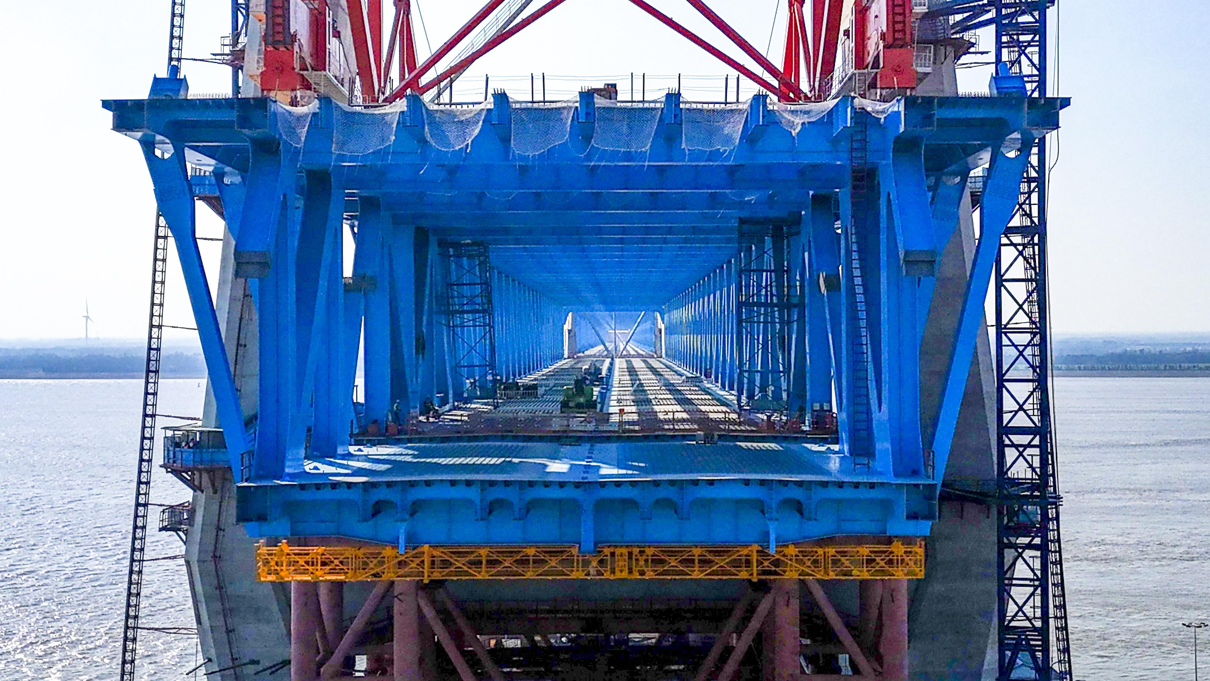 【江苏】崇启公铁长江大桥主通航孔南边跨钢梁吊装全部完成