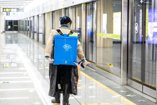 售票处、站内外扶手、直梯、手扶梯、座椅……每一个乘客可能会接触到的位置,帅凤仙都会仔细消毒。成都地铁升级防控措施后,对车站及列车内乘客接触的设备设施、公共区域的消杀频次从6小时一次提高至2小时一次。