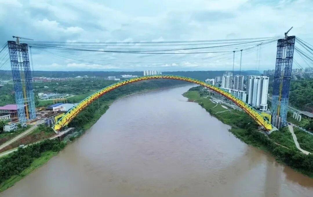 →→屏山县岷江二桥8根拱肋主弦管混凝土灌注工作全部完成,为后续拱上立柱、格子梁吊装施工奠定坚实基础。岷江二桥全长646米,主跨达446米,是中承式钢管混凝土拱桥。此次灌注的8根主弦管分属2条主拱肋上、下弦,全部采用C80高性能自密实混凝土,总灌注量约6200立方米。