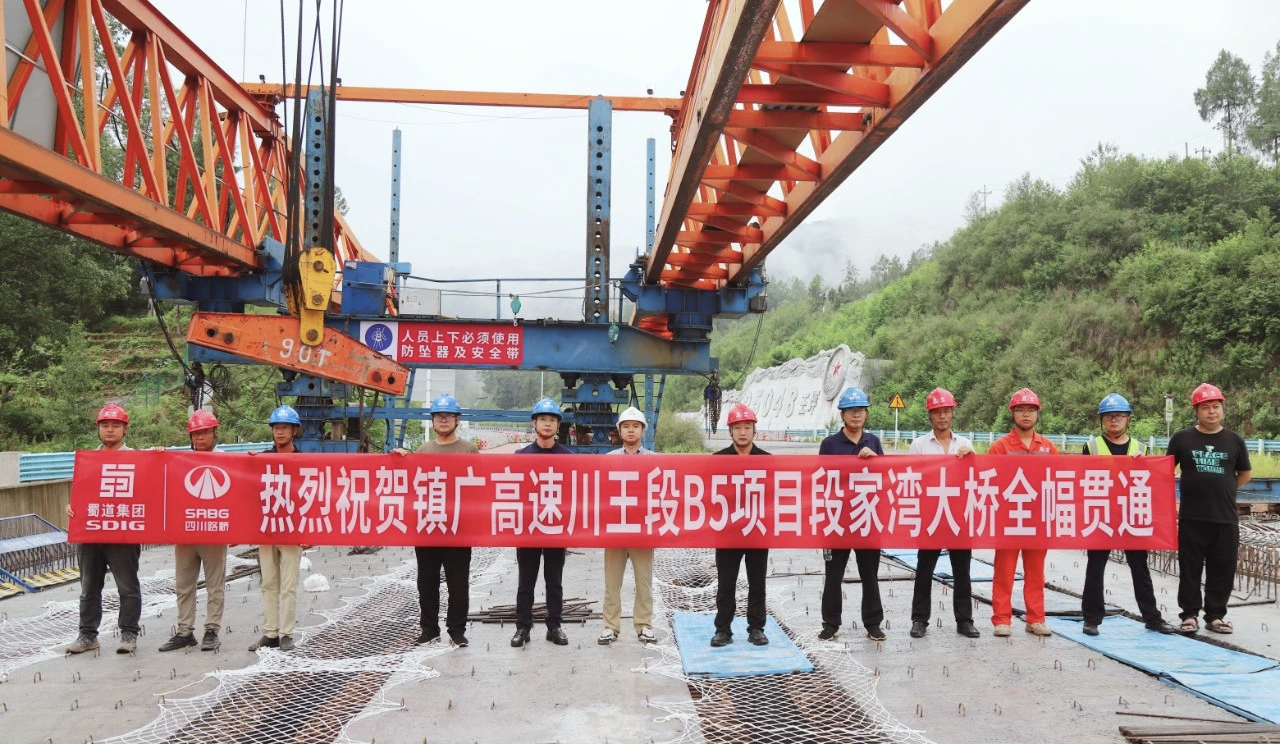 →→镇广高速公路川王段B5项目段家湾大桥全幅贯通。段家湾大桥位于通江县沙溪镇,全长369.5米,桥跨共设4联,桥梁上部结构采用预应力混凝土简支T梁,下部结构采用柱式墩台及桩基础。