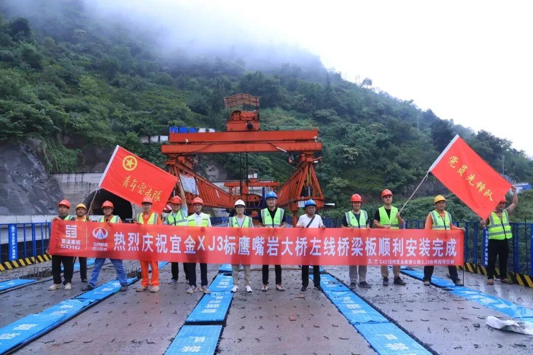→→宜攀高速公路新金段鹰嘴岩大桥左线预制T梁完成安装,标志着XJ3标预制梁板架设任务完成。鹰嘴岩大桥位于屏山县新市镇境内,为跨陡斜坡、冲沟而设的隧间桥,连接庙子湾隧道出口端与大溪沟隧道进口端,上部结构采用预应力混凝土简支T梁,左线跨径布置为7×30米,全长210.96米,共42片T梁。