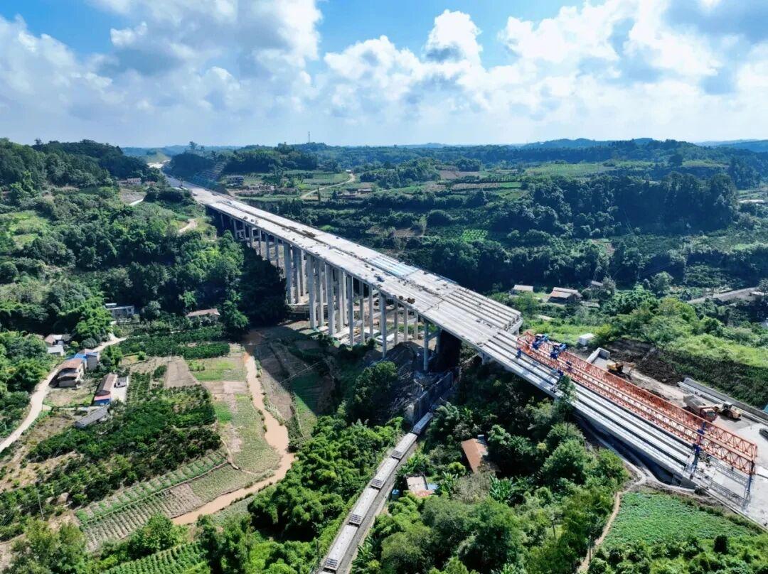 →→铜资高速公路后沟湾大桥实现半幅贯通,至此,铜资高速公路全线首个高风险涉铁工点被成功攻克,标志着铜资高速公路实现全线半幅贯通。后沟湾大桥全长509米,全桥共25跨8联,最高墩柱为右幅6号墩50.44米,全桥架设箱梁共125片,长40米,最大梁重170吨,采用240吨架桥机架设。