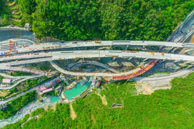 “雪宝山互通工程由中铁十一局五公司承建,桥梁占比99.6%,工程紧邻崇山峻岭和水流湍急的河道,没有一块平地,施工可谓是在‘刀尖上跳舞’。”施工现场技术负责人崔操介绍道,雪宝山互通主线桥是全线重难点、控制性工程,全长1292.5米,位于上下高差一百多米的悬崖边上,部分墩柱位于近乎90度的悬崖峭壁之上,仅修建辅助施工的临时便道就达2公里,施工难度大,安全风险高,材料运输困难。